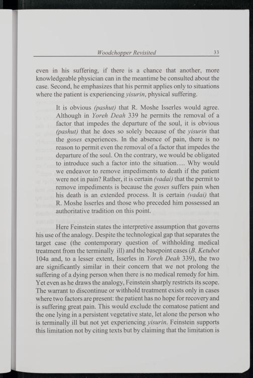 Here Feinstein states the interpretive assumption that governs his use of the analogy. Despite the technological gap that separates the target case(the contemporary question of withholding medical treatment from the terminally ill) and the basepoint cases(B. Ketubot 104a and, to a lesser extent, Isserles in Yoreh Deah 339), the two are significantly similar in their concern that we not prolong the suffering of a dying person when there is no medical remedy for him. Yet even as he draws the analogy, Feinstein sharply restricts its scope. The warrant to discontinue or withhold treatment exists only in cases where two factors are present: the patient has no hope for recovery and is suffering great pain. This would exclude the comatose patient and the one lying in a persistent vegetative state, let alone the person who is terminally ill but not yet experiencing yisurin. Feinstein supports this limitation not by citing texts but by claiming that the limitation is