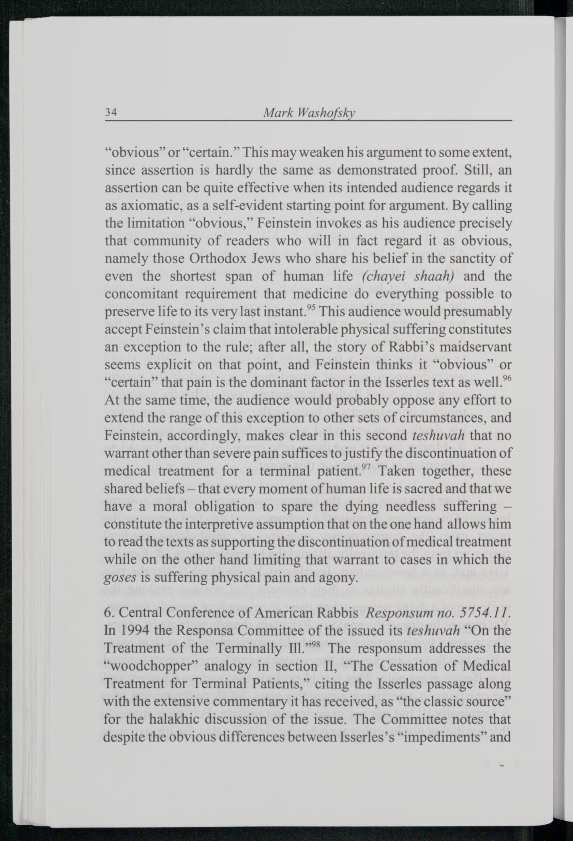 “obvious” or“certain.” This may weaken his argument to some extent, since assertion is hardly the same as demonstrated proof. Still, an assertion can be quite effective when its intended audience regards it as axiomatic, as a self-evident starting point for argument. By calling the limitation“obvious,” Feinstein invokes as his audience precisely that community of readers who will in fact regard it as obvious, namely those Orthodox Jews who share his belief in the sanctity of even the shortest span of human life(chayei shaah) and the concomitant requirement that medicine do everything possible to preserve life to its very last instant.” This audience would presumably accept Feinstein’s claim that intolerable physical suffering constitutes an exception to the rule; after all, the story of Rabbi ’s maidservant seems explicit on that point, and Feinstein thinks it“obvious” or “certain” that pain is the dominant factor in the Isserles text as well.” At the same time, the audience would probably oppose any effort to extend the range of this exception to other sets of circumstances, and Feinstein, accordingly, makes clear in this second teshuvah that no warrant other than severe pain suffices to justify the discontinuation of medical treatment for a terminal patient.”” Taken together, these shared beliefs— that every moment of human life is sacred and that we have a moral obligation to spare the dying needless suffering— constitute the interpretive assumption that on the one hand allows him to read the texts as supporting the discontinuation of medical treatment while on the other hand limiting that warrant to cases in which the goses is suffering physical pain and agony.