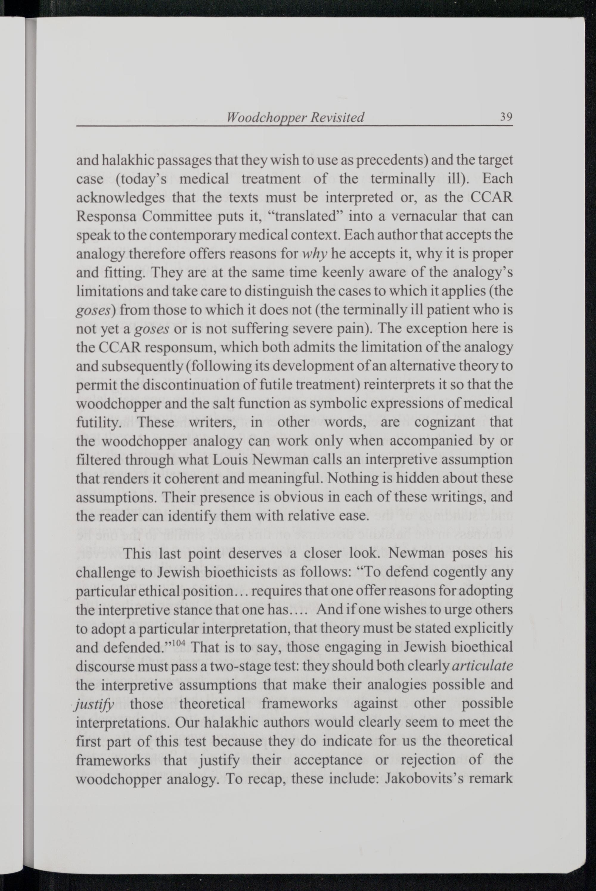 and halakhic passages that they wish to use as precedents) and the target case(today’s medical treatment of the terminally ill). Each acknowledges that the texts must be interpreted or, as the CCAR Responsa Committee puts it,“translated” into a vernacular that can speak to the contemporary medical context. Each author that accepts the analogy therefore offers reasons for why he accepts it, why it is proper and fitting. They are at the same time keenly aware of the analogy’s limitations and take care to distinguish the cases to which it applies(the goses) from those to which it does not(the terminally ill patient who is not yet a goses or is not suffering severe pain). The exception here is the CCAR responsum, which both admits the limitation of the analogy and subsequently(following its development of an alternative theory to permit the discontinuation of futile treatment) reinterprets it so that the woodchopper and the salt function as symbolic expressions of medical futility. These writers, in other words, are cognizant that the woodchopper analogy can work only when accompanied by or filtered through what Louis Newman calls an interpretive assumption that renders it coherent and meaningful. Nothing is hidden about these assumptions. Their presence is obvious in each of these writings, and the reader can identify them with relative ease.