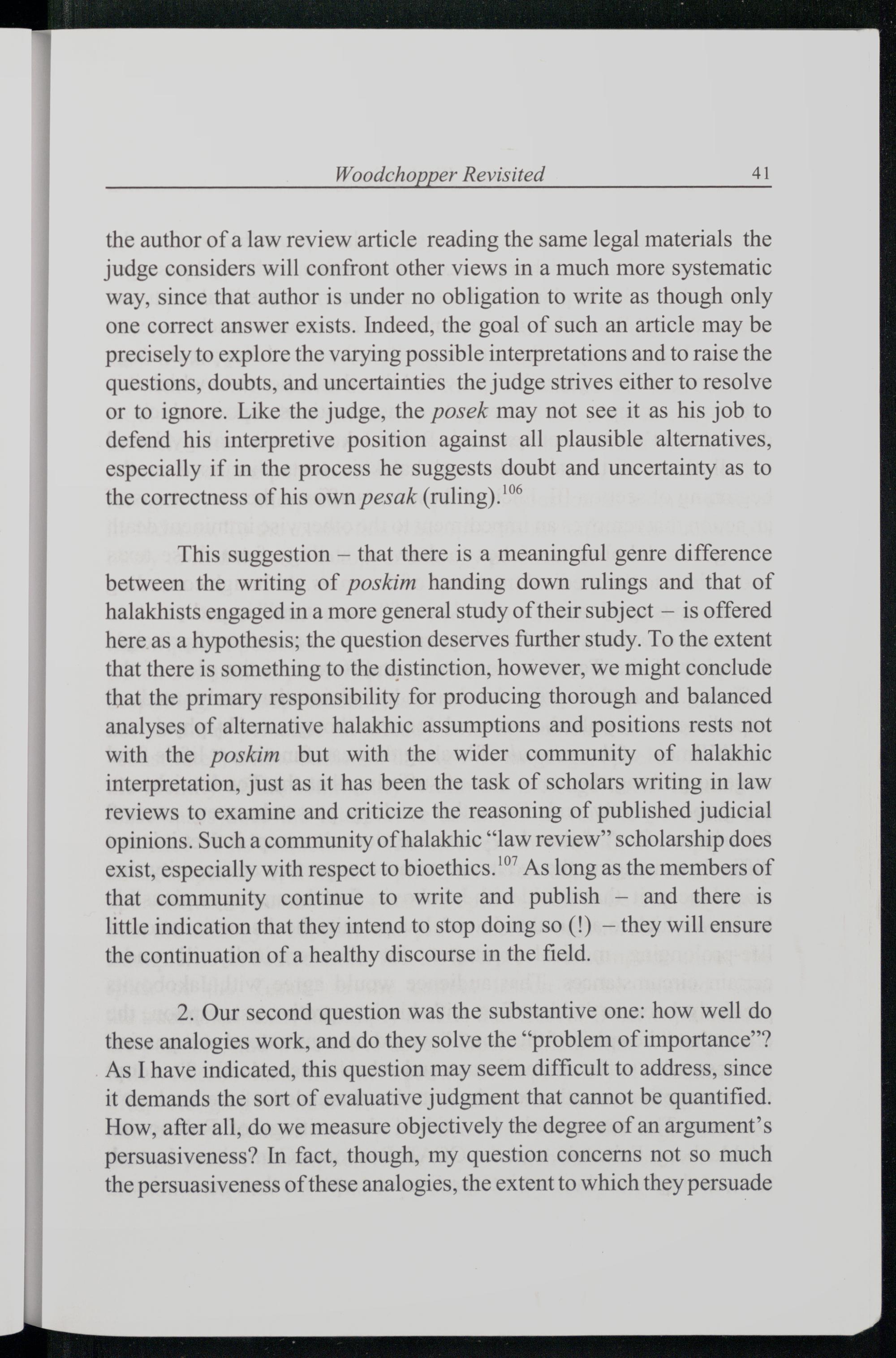 This suggestion— that there is a meaningful genre difference between the writing of poskim handing down rulings and that of halakhists engaged in a more general study of their subject— is offered here as a hypothesis; the question deserves further study. To the extent that there is something to the distinction, however, we might conclude that the primary responsibility for producing thorough and balanced analyses of alternative halakhic assumptions and positions rests not with the poskim but with the wider community of halakhic interpretation, just as it has been the task of scholars writing in law reviews to examine and criticize the reasoning of published judicial opinions. Such a community of halakhic“law review” scholarship does exist, especially with respect to bioethics.'”’” As long as the members of that community continue to write and publish— and there is little indication that they intend to stop doing so(!)— they will ensure the continuation of a healthy discourse in the field.