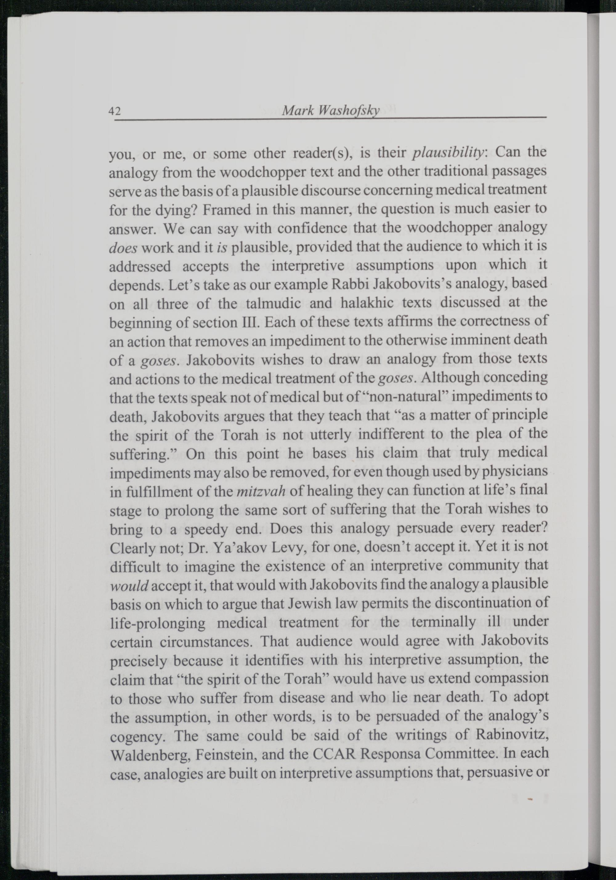 you, or me, or some other reader(s), is their plausibility: Can the analogy from the woodchopper text and the other traditional passages serve as the basis of a plausible discourse concerning medical treatment for the dying? Framed in this manner, the question is much easier to answer. We can say with confidence that the woodchopper analogy does work and it is plausible, provided that the audience to which it is addressed accepts the interpretive assumptions upon which it depends. Let’s take as our example Rabbi Jakobovits’s analogy, based on all three of the talmudic and halakhic texts discussed at the beginning of section III. Each of these texts affirms the correctness of an action that removes an impediment to the otherwise imminent death of a goses. Jakobovits wishes to draw an analogy from those texts and actions to the medical treatment of the goses. Although conceding that the texts speak not of medical but of“non-natural” impediments to death, Jakobovits argues that they teach that“as a matter of principle the spirit of the Torah is not utterly indifferent to the plea of the suffering.” On this point he bases his claim that truly medical impediments may also be removed, for even though used by physicians in fulfillment of the mitzvah of healing they can function at life’s final stage to prolong the same sort of suffering that the Torah wishes to bring to a speedy end. Does this analogy persuade every reader? Clearly not; Dr. Ya’akov Levy, for one, doesn’t accept it. Yet it is not difficult to imagine the existence of an interpretive community that would accept it, that would with Jakobovits find the analogy a plausible basis on which to argue that Jewish law permits the discontinuation of life-prolonging medical treatment for the terminally ill under certain circumstances. That audience would agree with Jakobovits precisely because it identifies with his interpretive assumption, the claim that“the spirit of the Torah ” would have us extend compassion to those who suffer from disease and who lie near death. To adopt the assumption, in other words, is to be persuaded of the analogy’s cogency. The same could be said of the writings of Rabinovitz, Waldenberg, Feinstein, and the CCAR Responsa Committee. In each case, analogies are built on interpretive assumptions that, persuasive or