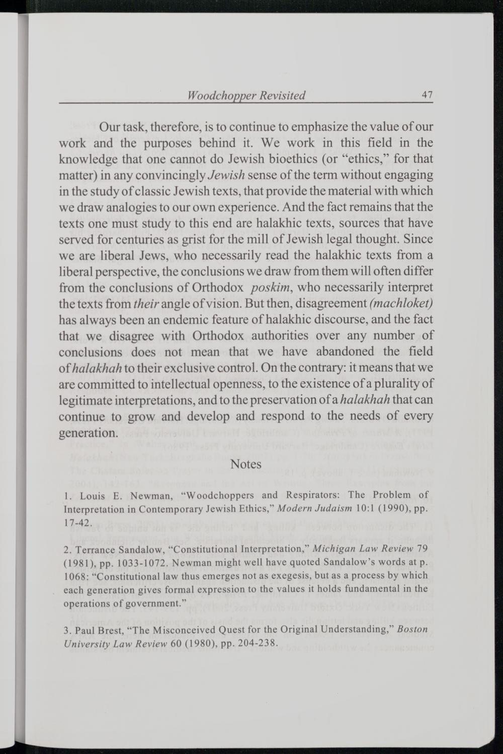 1. Louis E. Newman,“Woodchoppers and Respirators: The Problem of Interpretation in Contemporary Jewish Ethics,” Modern Judaism 10:1(1990), pp. 17-42.