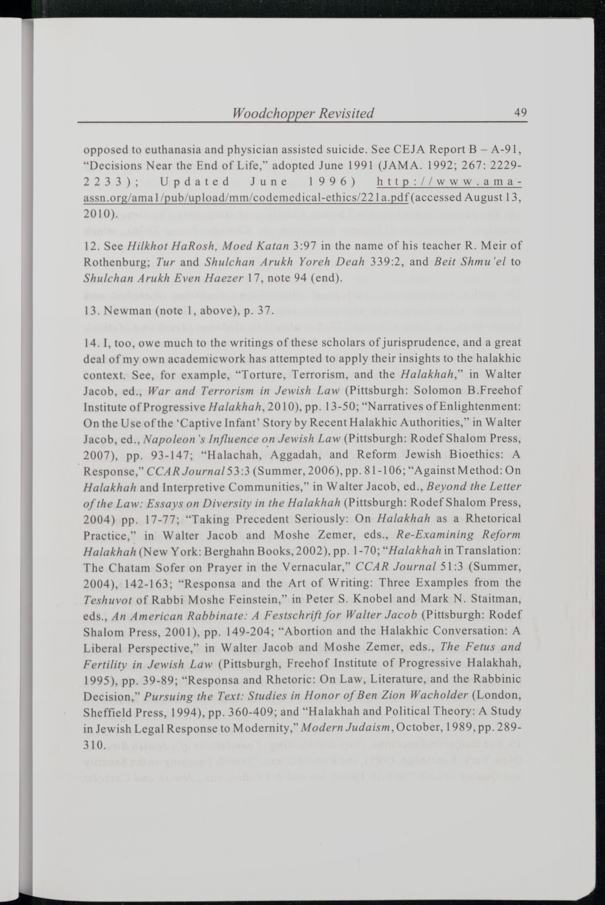 14.1, too, owe much to the writings of these scholars of jurisprudence, and a great deal of my own academicwork has attempted to apply their insights to the halakhic context. See, for example,“Torture, Terrorism, and the Halakhah, ” in Walter Jacob , ed., War and Terrorism in Jewish Law(Pittsburgh : Solomon B.Freehof Institute of Progressive Halakhah,2010), pp. 13-50;“Narratives of Enlightenment: On the Use of the‘Captive Infant’ Story by Recent Halakhic Authorities,” in Walter Jacob , ed., Napoleon's Influence on Jewish Law(Pittsburgh : Rodef Shalom Press, 2007), pp. 93-147;“Halachah , Aggadah , and Reform Jewish Bioethics: A Response,” CCAR Journal 53:3(Summer, 2006), pp. 81-106;“Against Method: On Halakhah and Interpretive Communities,” in Walter Jacob , ed., Beyond the Letter of the Law: Essays on Diversity in the Halakhah(Pittsburgh : Rodef Shalom Press, 2004) pp. 17-77;“Taking Precedent Seriously: On Halakhah as a Rhetorical Practice,” in Walter Jacob and Moshe Zemer , eds., Re-Examining Reform Halakhah(New Y ork: Berghahn Books, 2002), pp. 1-70;“Halakhah in Translation: The Chatam Sofer on Prayer in the Vernacular,” CCAR Journal 51:3(Summer, 2004), 142-163;“Responsa and the Art of Writing: Three Examples from the Teshuvot of Rabbi Moshe Feinstein, ” in Peter S. Knobel and Mark N. Staitman, eds., An American Rabbinate: A Festschrift for Walter Jacob (Pittsburgh : Rodef Shalom Press, 2001), pp. 149-204;“Abortion and the Halakhic Conversation: A Liberal Perspective,” in Walter Jacob and Moshe Zemer , eds., The Fetus and Fertility in Jewish Law(Pittsburgh , Freehof Institute of Progressive Halakhah, 1995), pp. 39-89;“Responsa and Rhetoric: On Law, Literature, and the Rabbinic Decision,” Pursuing the Text: Studies in Honor of Ben Zion Wacholder(London , Sheffield Press, 1994), pp. 360-409; and“Halakhah and Political Theory: A Study in Jewish Legal Response to Modernity,” Modern Judaism , October, 1989, pp. 289310.