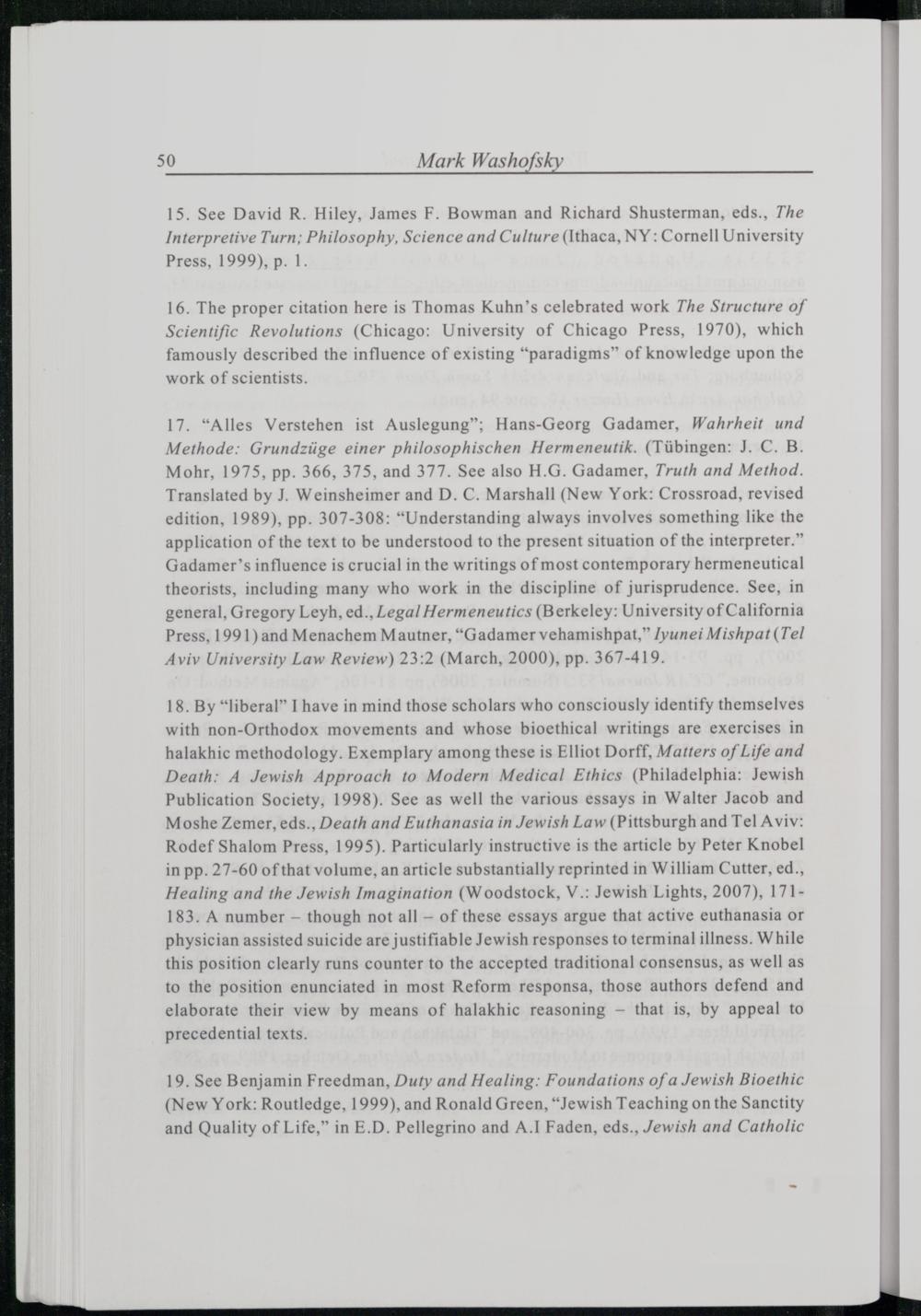 17.“Alles Verstehen ist Auslegung”; Hans-Georg Gadamer , Wahrheit und Methode: Grundziige einer philosophischen Hermeneutik.(Tiibingen: J. C. B. Mohr, 1975, pp. 366, 375, and 377. See also H.G. Gadamer , Truth and Method . Translated by J. Weinsheimer and D. C. Marshall(New York : Crossroad, revised edition, 1989), pp. 307-308:“Understanding always involves something like the application of the text to be understood to the present situation of the interpreter.” Gadamer ’s influence is crucial in the writings of most contemporary hermeneutical theorists, including many who work in the discipline of jurisprudence. See, in general, Gregory Leyh, ed., Legal Hermeneutics(Berkeley : University of California Press , 1991) and Menachem Mautner ,“Gadamer vehamishpat,” Iyunei Mishpat(Tel Aviv University Law Review) 23:2(March, 2000), pp. 367-419.