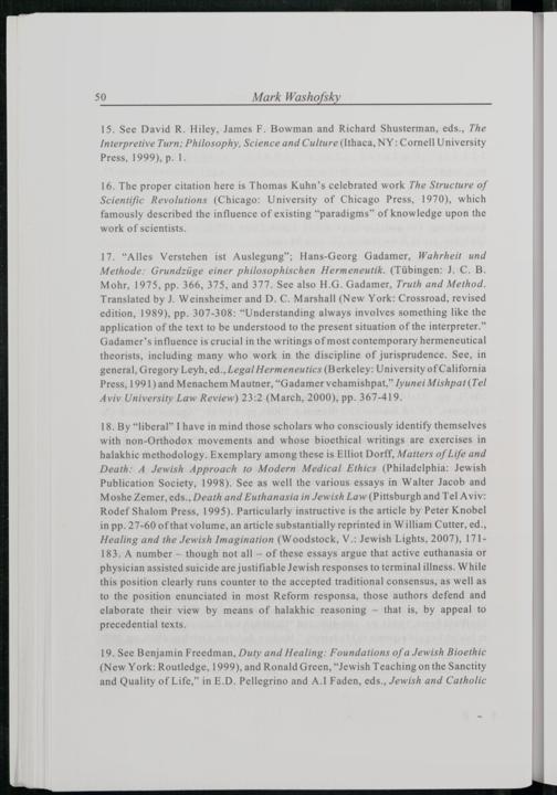 18. By“liberal” I have in mind those scholars who consciously identify themselves with non-Orthodox movements and whose bioethical writings are exercises in halakhic methodology. Exemplary among these is Elliot Dorff, Matters of Life and Death: A Jewish Approach to Modern Medical Ethics(Philadelphia : Jewish Publication Society , 1998). See as well the various essays in Walter Jacob and Moshe Zemer , eds., Death and Euthanasia in Jewish Law(Pittsburgh and Tel Aviv : Rodef Shalom Press, 1995). Particularly instructive is the article by Peter Knobel in pp. 27-60 of that volume, an article substantially reprinted in William Cutter, ed., Healing and the Jewish Imagination(Woodstock, V.: Jewish Lights, 2007), 171183. A number— though not all— of these essays argue that active euthanasia or physician assisted suicide are justifiable Jewish responses to terminal illness. While this position clearly runs counter to the accepted traditional consensus, as well as to the position enunciated in most Reform responsa, those authors defend and elaborate their view by means of halakhic reasoning— that is, by appeal to precedential texts.
