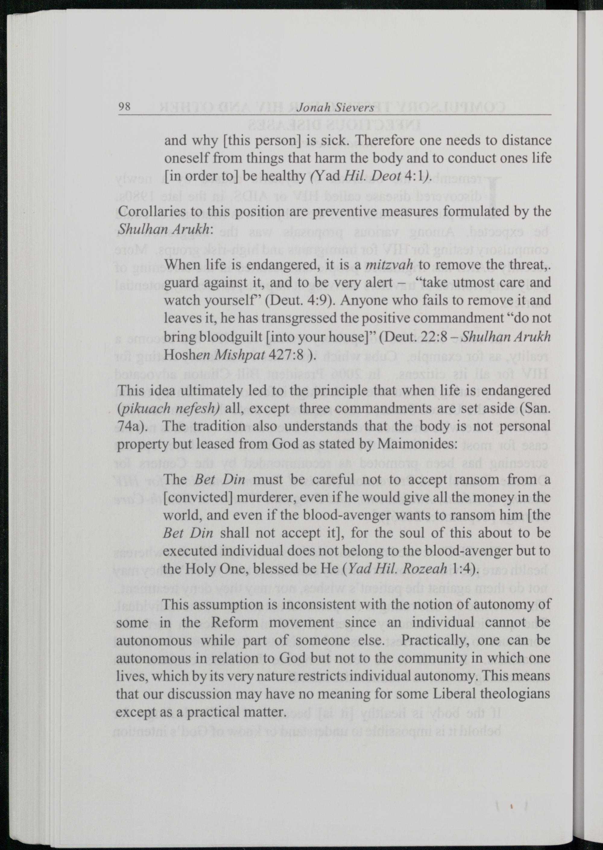 and why[this person] is sick. Therefore one needs to distance oneself from things that harm the body and to conduct ones life [in order to] be healthy(Yad Hil. Deot 4:1).