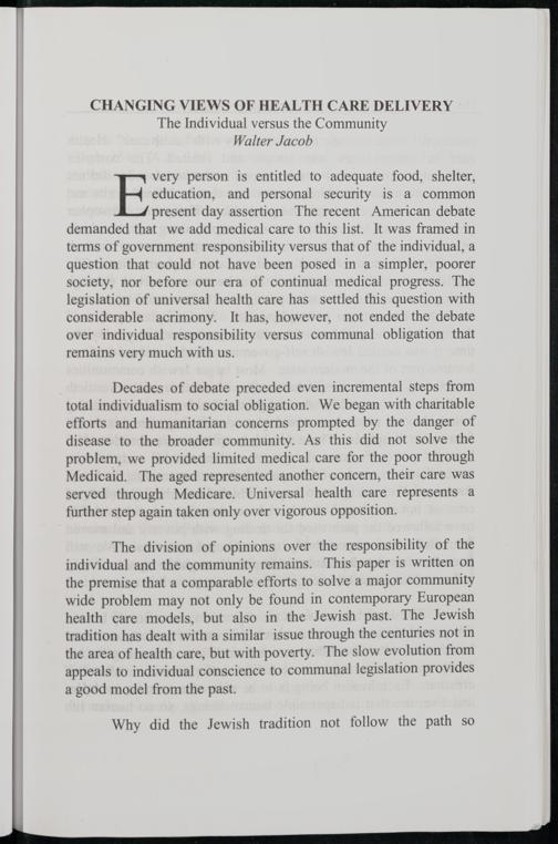 The division of opinions over the responsibility of the individual and the community remains. This paper is written on the premise that a comparable efforts to solve a major community wide problem may not only be found in contemporary European health care models, but also in the Jewish past. The Jewish tradition has dealt with a similar issue through the centuries not in the area of health care, but with poverty. The slow evolution from appeals to individual conscience to communal legislation provides a good model from the past.
