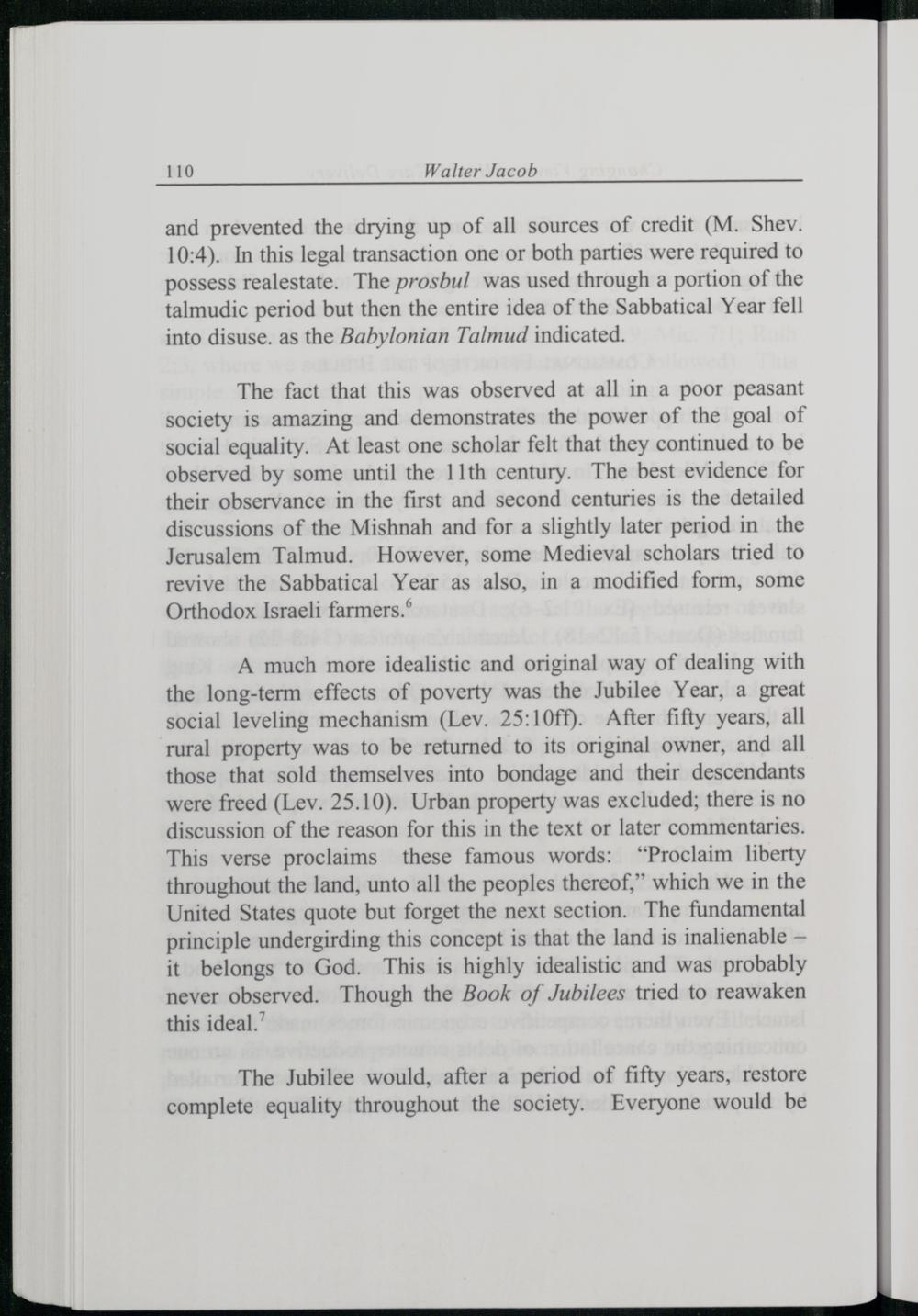 A much more idealistic and original way of dealing with the long-term effects of poverty was the Jubilee Year , a great social leveling mechanism (Lev. 25:10ff). After fifty years, all rural property was to be returned to its original owner, and all those that sold themselves into bondage and their descendants were freed(Lev. 25.10). Urban property was excluded; there is no discussion of the reason for this in the text or later commentaries. This verse proclaims these famous words:“Proclaim liberty throughout the land, unto all the peoples thereof,” which we in the United States quote but forget the next section. The fundamental principle undergirding this concept is that the land is inalienable— it belongs to God . This is highly idealistic and was probably never observed. Though the Book of Jubilees tried to reawaken this ideal.’