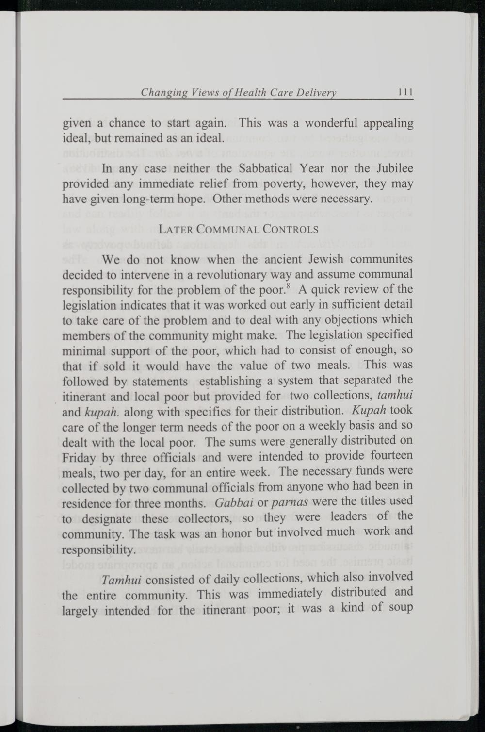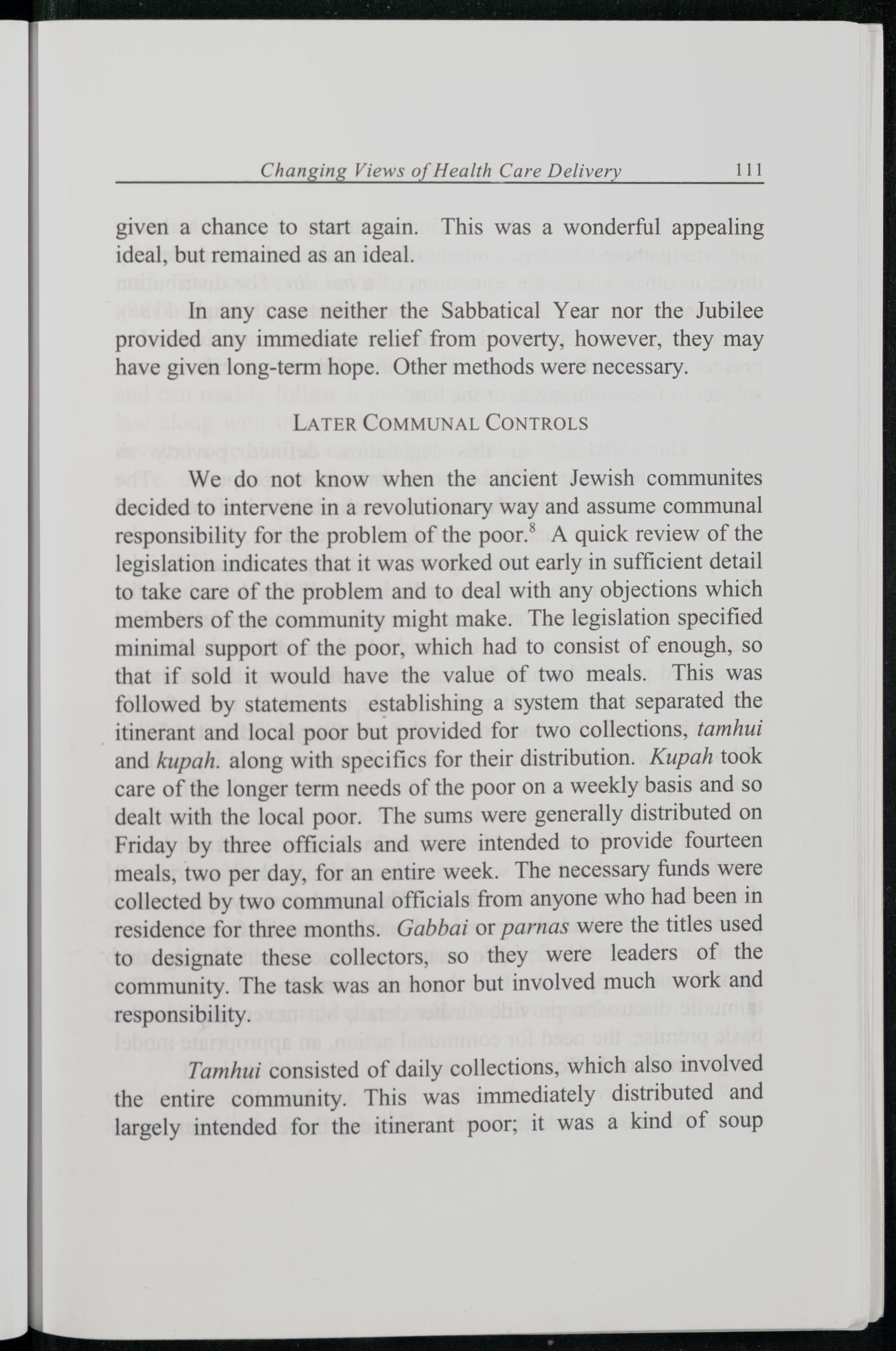 We do not know when the ancient Jewish communites decided to intervene in a revolutionary way and assume communal responsibility for the problem of the poor.® A quick review of the legislation indicates that it was worked out early in sufficient detail to take care of the problem and to deal with any objections which members of the community might make. The legislation specified minimal support of the poor, which had to consist of enough, so that if sold it would have the value of two meals. This was followed by statements establishing a system that separated the itinerant and local poor but provided for two collections, tamhui and kupah. along with specifics for their distribution. Kupah took care of the longer term needs of the poor on a weekly basis and so dealt with the local poor. The sums were generally distributed on Friday by three officials and were intended to provide fourteen meals, two per day, for an entire week. The necessary funds were collected by two communal officials from anyone who had been in residence for three months. Gabbai or parnas were the titles used to designate these collectors, so they were leaders of the community. The task was an honor but involved much work and responsibility.