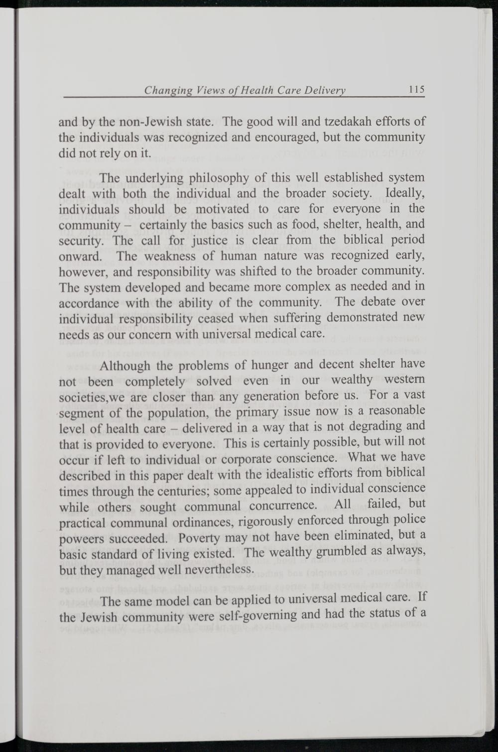 The underlying philosophy of this well established system dealt with both the individual and the broader society. Ideally, individuals should be motivated to care for everyone in the community— certainly the basics such as food, shelter, health, and security. The call for justice is clear from the biblical period onward. The weakness of human nature was recognized early, however, and responsibility was shifted to the broader community. The system developed and became more complex as needed and in accordance with the ability of the community. The debate over individual responsibility ceased when suffering demonstrated new needs as our concern with universal medical care.