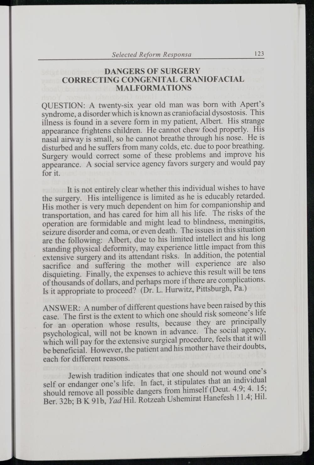 It is not entirely clear whether this individual wishes to have the surgery. His intelligence is limited as he is educably retarded. His mother is very much dependent on him for companionship and transportation, and has cared for him all his life. The risks of the operation are formidable and might lead to blindness, meningitis, seizure disorder and coma, or even death. The issues in this situation are the following: Albert, due to his limited intellect and his long standing physical deformity, may experience little impact from this extensive surgery and its attendant risks. In addition, the potential sacrifice and suffering the mother will experience are also disquieting. Finally, the expenses to achieve this result will be tens of thousands of dollars, and perhaps more if there are complications. Is it appropriate to proceed?(Dr. L. Hurwitz, Pittsburgh , Pa .)