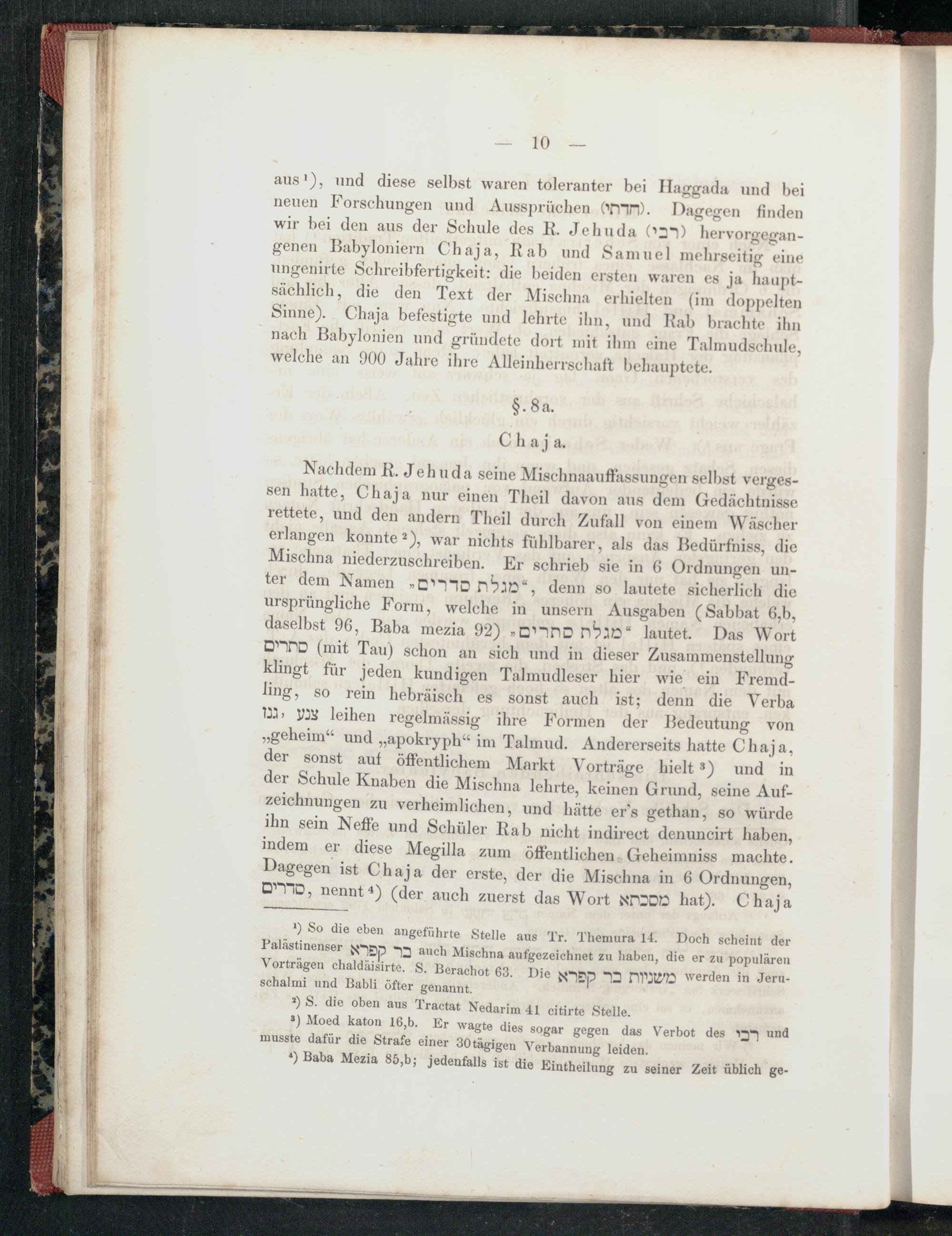 1 leihen regelmässig ihre Formen der Bedeutung von ,, geheim“ und„, apokryph" im Talmud . Andererseits hatte Chaja, der sonst auf öffentlichem Markt Vorträge hielt 3) und in der Schule Knaben die Mischna lehrte, keinen Grund, seine Aufzeichnungen zu verheimlichen, und hätte er's gethan, so würde ihn sein Neffe und Schüler Rab nicht indirect denuncirt haben, indem er diese Megilla zum öffentlichen Geheimniss machte. Dagegen ist Chaja der erste, der die Mischna in 6 Ordnungen, OD, nennt 4)( der auch zuerst das Wort NDD hat). Chaja
