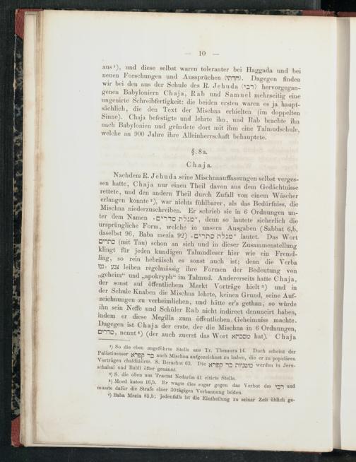 Nachdem R. Jehuda seine Mischnaauffassungen selbst vergessen hatte, Chaja nur einen Theil davon aus dem Gedächtnisse rettete, und den andern Theil durch Zufall von einem Wäscher erlangen konnte 2), war nichts fühlbarer, als das Bedürfniss, die Mischna niederzuschreiben. Er schrieb sie in 6 Ordnungen unter dem Namen ", denn so lautete sicherlich die ursprüngliche Form, welche in unsern Ausgaben( Sabbat 6, b, daselbst 96, Baba mezia 92) no nan lautet. Das Wort DnD( mit Tau) schon an sich und in dieser Zusammenstellung klingt für jeden kundigen Talmudleser hier wie ein Fremdling, so rein hebräisch es sonst auch ist; denn die Verba