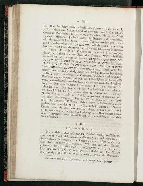 ist. Der vier Jahre später schreibende Pinner( l. c.) kennt L. nicht, spricht aus Autopsie und ist genauer. Nach ihm ist der Codex in Pergament, klein Folio, 576 Seiten, die in der Mitte stehende Mischna Quadratschrift, die Gemara mit gemischter, oft sehr undeutlicher Schrift. Dem Talmud vorher geht noch
