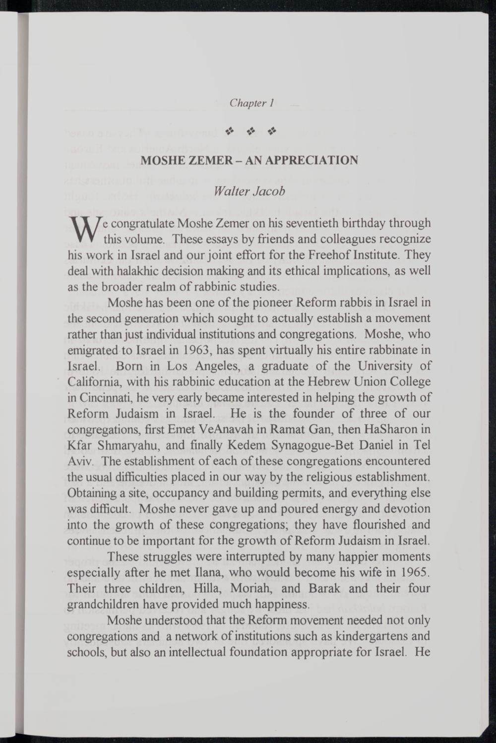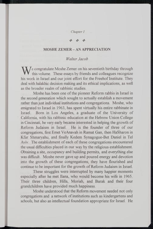We congratulate Moshe Zemer on his seventieth birthday through this volume. These essays by friends and colleagues recognize his work in Israel and our joint effort for the Freehof Institute. They deal with halakhic decision making and its ethical implications, as well as the broader realm of rabbinic studies.