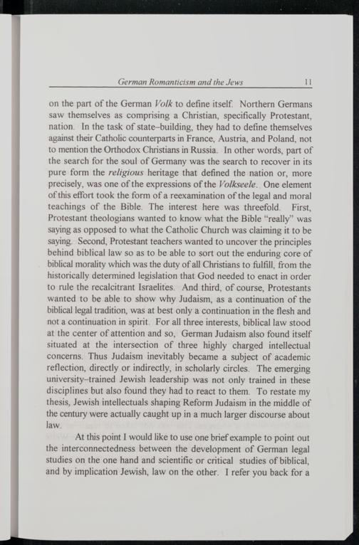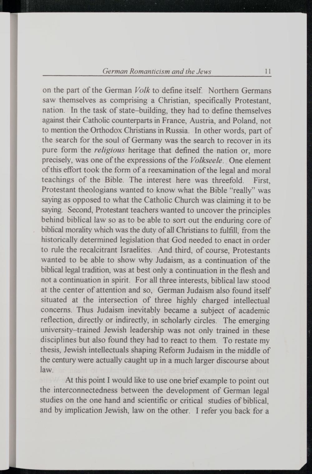on the part of the German Volk to define itself. Northern Germans saw themselves as comprising a Christian , specifically Protestant , nation. In the task of state-building, they had to define themselves against their Catholic counterparts in France , Austria , and Poland , not to mention the Orthodox Christians in Russia . In other words, part of the search for the soul of Germany was the search to recover in its pure form the religious heritage that defined the nation or, more precisely, was one of the expressions of the Volkseele. One element of this effort took the form of a reexamination of the legal and moral teachings of the Bible . The interest here was threefold. First, Protestant theologians wanted to know what the Bible “really” was saying as opposed to what the Catholic Church was claiming it to be saying. Second, Protestant teachers wanted to uncover the principles behind biblical law so as to be able to sort out the enduring core of biblical morality which was the duty of all Christians to fulfill, from the historically determined legislation that God needed to enact in order to rule the recalcitrant Israelites . And third, of course, Protestants wanted to be able to show why Judaism , as a continuation of the biblical legal tradition, was at best only a continuation in the flesh and not a continuation in spirit. For all three interests, biblical law stood at the center of attention and so, German Judaism also found itself situated at the intersection of three highly charged intellectual concerns. Thus Judaism inevitably became a subject of academic reflection, directly or indirectly, in scholarly circles. The emerging university—trained Jewish leadership was not only trained in these disciplines but also found they had to react to them. To restate my thesis, Jewish intellectuals shaping Reform Judaism in the middle of the century were actually caught up in a much larger discourse about law.