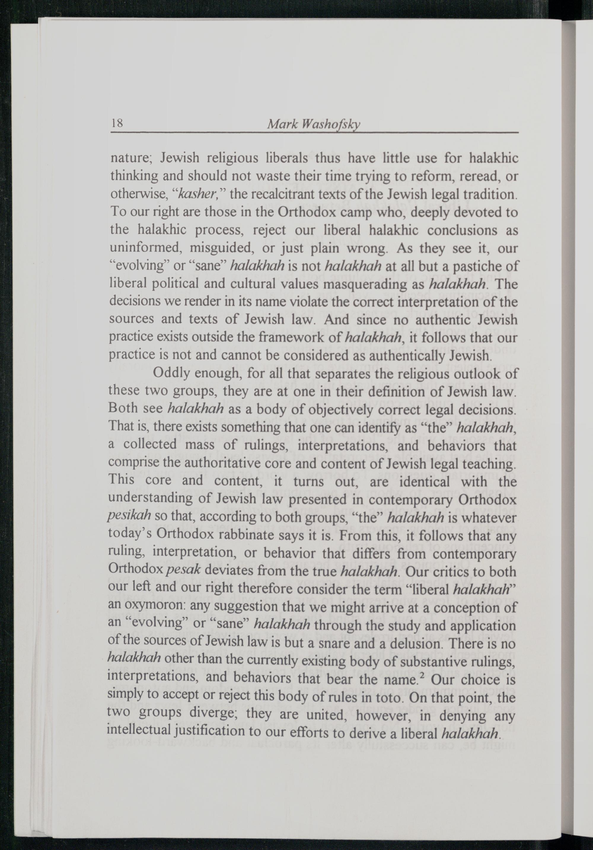 nature; Jewish religious liberals thus have little use for halakhic thinking and should not waste their time trying to reform, reread, or otherwise,“kasher,” the recalcitrant texts of the Jewish legal tradition. To our right are those in the Orthodox camp who, deeply devoted to the halakhic process, reject our liberal halakhic conclusions as uninformed, misguided, or just plain wrong. As they see it, our “evolving” or“sane” halakhah is not halakhah at all but a pastiche of liberal political and cultural values masquerading as halakhah. The decisions we render in its name violate the correct interpretation of the sources and texts of Jewish law. And since no authentic Jewish practice exists outside the framework of halakhah, it follows that our practice is not and cannot be considered as authentically Jewish . Oddly enough, for all that separates the religious outlook of these two groups, they are at one in their definition of Jewish law. Both see halakhah as a body of objectively correct legal decisions. That is, there exists something that one can identify as“the” halakhah, a collected mass of rulings, interpretations, and behaviors that comprise the authoritative core and content of Jewish legal teaching. This core and content, it turns out, are identical with the understanding of Jewish law presented in contemporary Orthodox pesikah so that, according to both groups,“the” halakhah is whatever today’s Orthodox rabbinate says it is. From this, it follows that any ruling, interpretation, or behavior that differs from contemporary Orthodox pesak deviates from the true halakhah. Our critics to both our left and our right therefore consider the term“liberal Aalakhah” an oxymoron: any suggestion that we might arrive at a conception of an“evolving” or“sane” halakhah through the study and application of the sources of Jewish law is but a snare and a delusion. There is no halakhah other than the currently existing body of substantive rulings, interpretations, and behaviors that bear the name.2 Our choice is simply to accept or reject this body of rules in toto. On that point, the two groups diverge; they are united, however, in denying any intellectual justification to our efforts to derive a liberal halakhah.