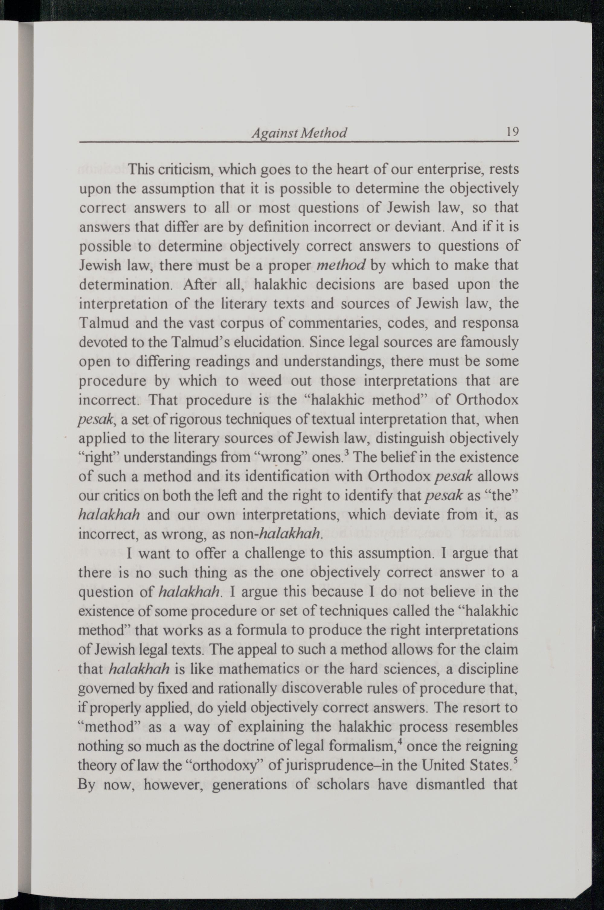 I want to offer a challenge to this assumption. I argue that there is no such thing as the one objectively correct answer to a question of halakhah. 1 argue this because I do not believe in the existence of some procedure or set of techniques called the“halakhic method” that works as a formula to produce the right interpretations of Jewish legal texts. The appeal to such a method allows for the claim that halakhah is like mathematics or the hard sciences, a discipline governed by fixed and rationally discoverable rules of procedure that, if properly applied, do yield objectively correct answers. The resort to “method” as a way of explaining the halakhic process resembles nothing so much as the doctrine of legal formalism,* once the reigning theory of law the“orthodoxy” of jurisprudence—in the United States .’ By now, however, generations of scholars have dismantled that