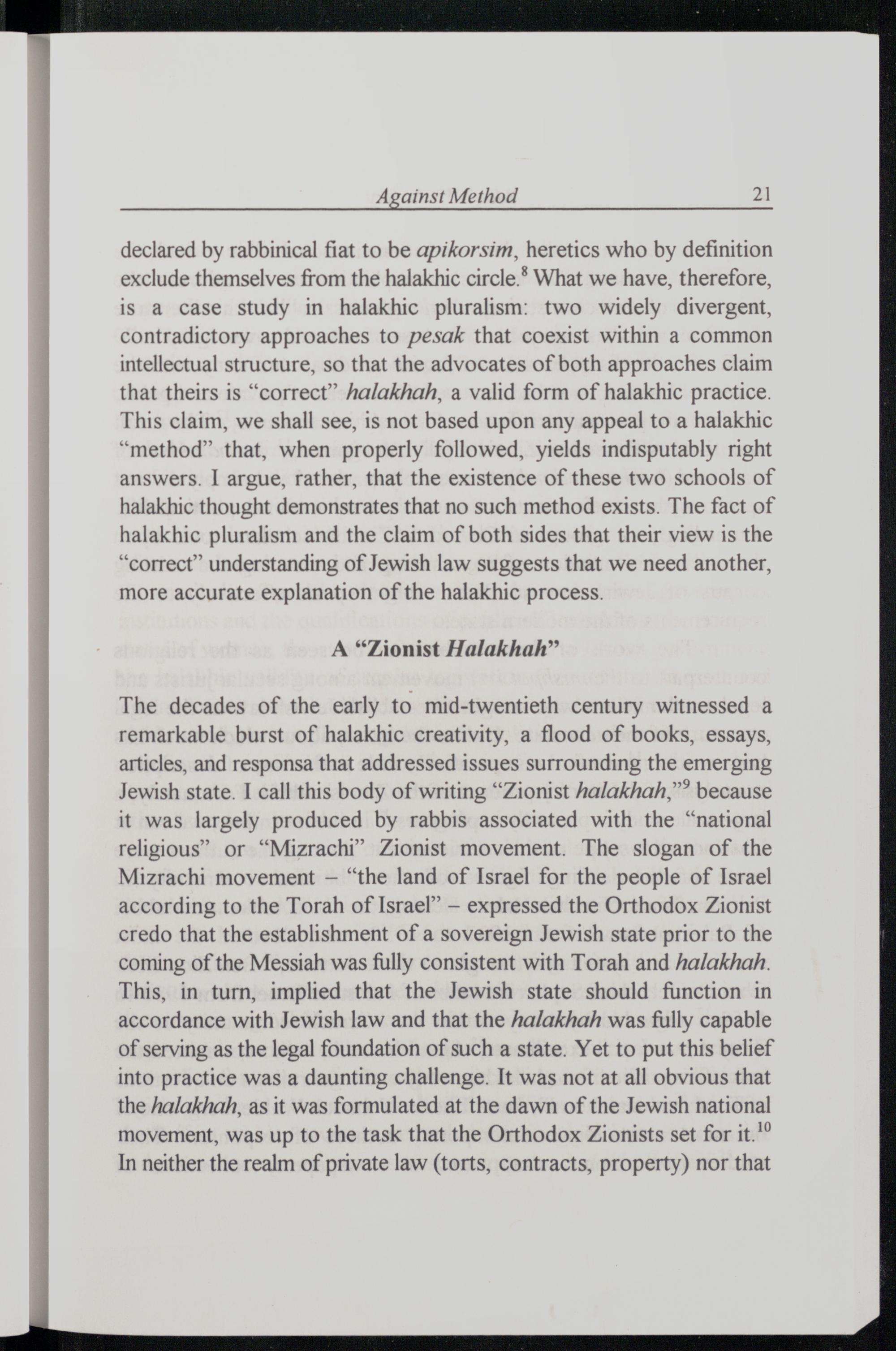 declared by rabbinical fiat to be apikorsim, heretics who by definition exclude themselves from the halakhic circle.®* What we have, therefore, is a case study in halakhic pluralism: two widely divergent, contradictory approaches to pesak that coexist within a common intellectual structure, so that the advocates of both approaches claim that theirs is“correct” halakhah, a valid form of halakhic practice. This claim, we shall see, is not based upon any appeal to a halakhic “method” that, when properly followed, yields indisputably right answers.| argue, rather, that the existence of these two schools of halakhic thought demonstrates that no such method exists. The fact of halakhic pluralism and the claim of both sides that their view is the “correct” understanding of Jewish law suggests that we need another, more accurate explanation of the halakhic process.