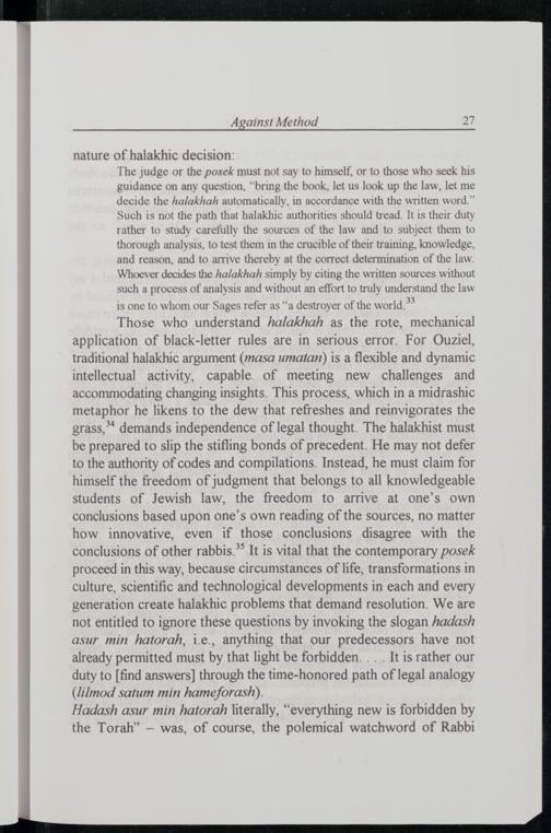 nature of halakhic decision: The judge or the posek must not say to himself, or to those who seek his guidance on any question,“bring the book, let us look up the law, let me decide the halakhah automatically, in accordance with the written word.” Such is not the path that halakhic authorities should tread. It is their duty rather to study carefully the sources of the law and to subject them to thorough analysis, to test them in the crucible of their training, knowledge, and reason, and to arrive thereby at the correct determination of the law. Whoever decides the halakhah simply by citing the written sources without such a process of analysis and without an effort to truly understand the law is one to whom our Sages refer as“a destroyer of the world.> Those who understand halakhah as the rote, mechanical application of black-letter rules are in serious error. For Ouziel, traditional halakhic argument(masa umatan) is a flexible and dynamic intellectual activity, capable. of meeting new challenges and accommodating changing insights. This process, which in a midrashic metaphor he likens to the dew that refreshes and reinvigorates the grass,’ demands independence of legal thought. The halakhist must be prepared to slip the stifling bonds of precedent. He may not defer to the authority of codes and compilations. Instead, he must claim for himself the freedom of judgment that belongs to all knowledgeable students of Jewish law, the freedom to arrive at one’s own conclusions based upon one’s own reading of the sources, no matter how innovative, even if those conclusions disagree with the conclusions of other rabbis.* It is vital that the contemporary posek proceed in this way, because circumstances of life, transformations in culture, scientific and technological developments in each and every generation create halakhic problems that demand resolution. We are not entitled to ignore these questions by invoking the slogan hadash asur min hatorah, i.e., anything that our predecessors have not already permitted must by that light be forbidden.... It is rather our duty to[find answers] through the time-honored path of legal analogy (lilmod satum min hameforash). Hadash asur min hatorah literally,“everything new is forbidden by the Torah ”— was, of course, the polemical watchword of Rabbi