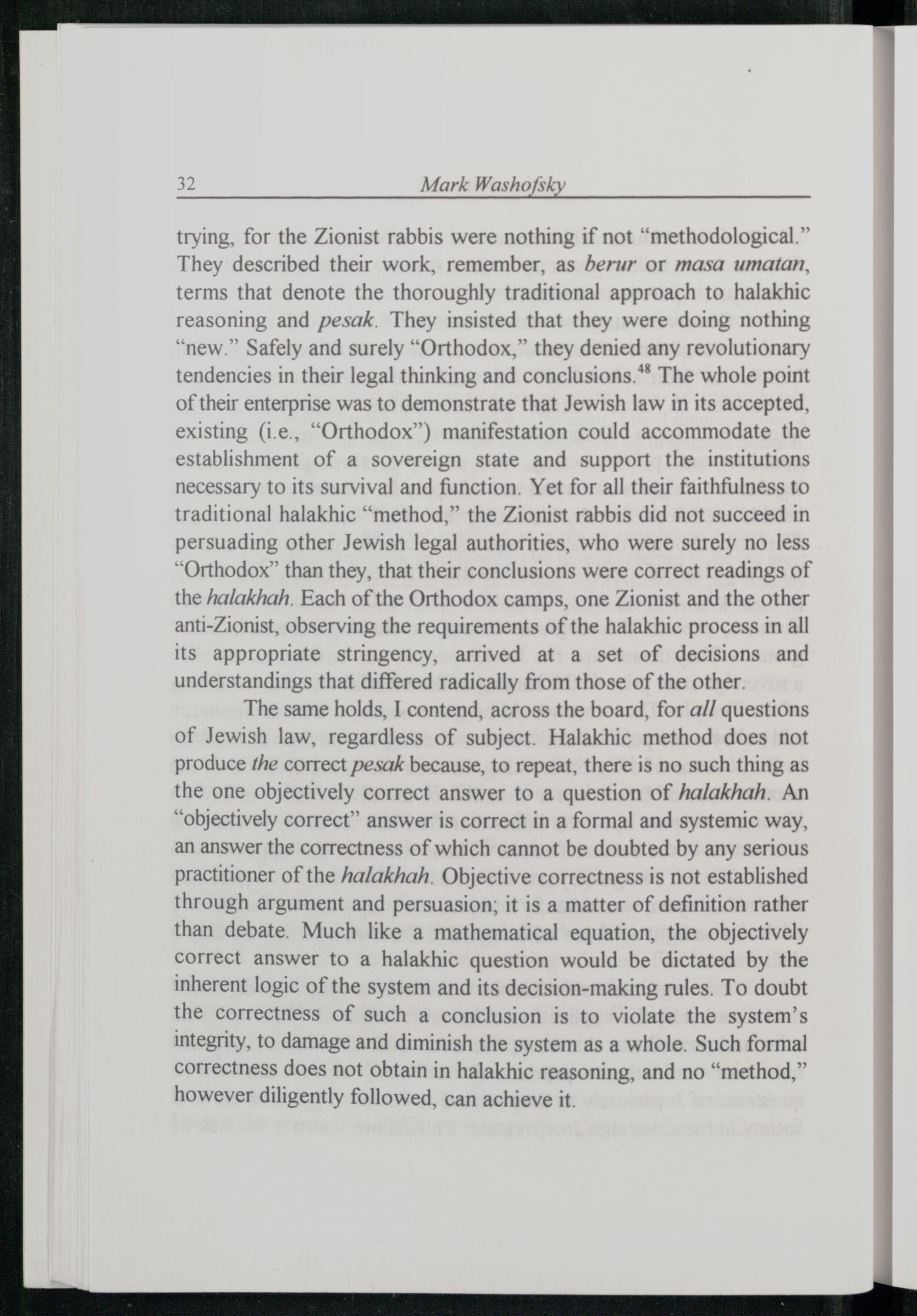 trying, for the Zionist rabbis were nothing if not“methodological.” They described their work, remember, as berur or masa umatan, terms that denote the thoroughly traditional approach to halakhic reasoning and pesak. They insisted that they were doing nothing “new.” Safely and surely“Orthodox, ” they denied any revolutionary tendencies in their legal thinking and conclusions.*® The whole point of their enterprise was to demonstrate that Jewish law in its accepted, existing(i.e.,“Orthodox ”) manifestation could accommodate the establishment of a sovereign state and support the institutions necessary to its survival and function. Yet for all their faithfulness to traditional halakhic“method,” the Zionist rabbis did not succeed in persuading other Jewish legal authorities, who were surely no less “Orthodox ” than they, that their conclusions were correct readings of the halakhah. Each of the Orthodox camps, one Zionist and the other anti-Zionist , observing the requirements of the halakhic process in all its appropriate stringency, arrived at a set of decisions and understandings that differed radically from those of the other.