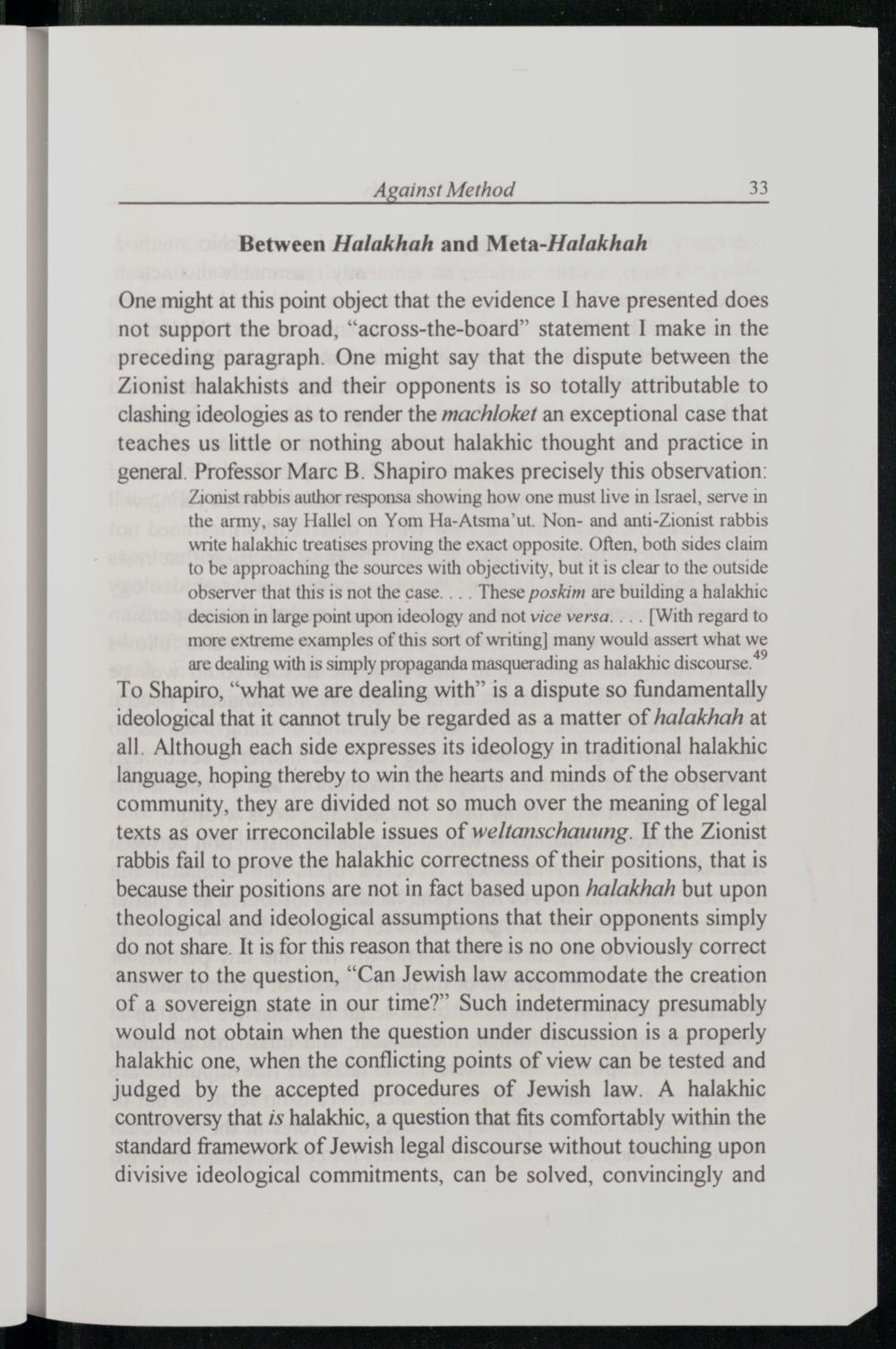 are dealing with is simply propaganda masquerading as halakhic discourse.*’ To Shapiro ,“what we are dealing with” is a dispute so fundamentally ideological that it cannot truly be regarded as a matter of halakhah at all. Although each side expresses its ideology in traditional halakhic language, hoping thereby to win the hearts and minds of the observant community, they are divided not so much over the meaning of legal texts as over irreconcilable issues of weltanschauung. If the Zionist rabbis fail to prove the halakhic correctness of their positions, that is because their positions are not in fact based upon halakhah but upon theological and ideological assumptions that their opponents simply do not share. It is for this reason that there is no one obviously correct answer to the question,“Can Jewish law accommodate the creation of a sovereign state in our time?” Such indeterminacy presumably would not obtain when the question under discussion is a properly halakhic one, when the conflicting points of view can be tested and judged by the accepted procedures of Jewish law. A halakhic controversy that is halakhic, a question that fits comfortably within the standard framework of Jewish legal discourse without touching upon divisive ideological commitments, can be solved, convincingly and