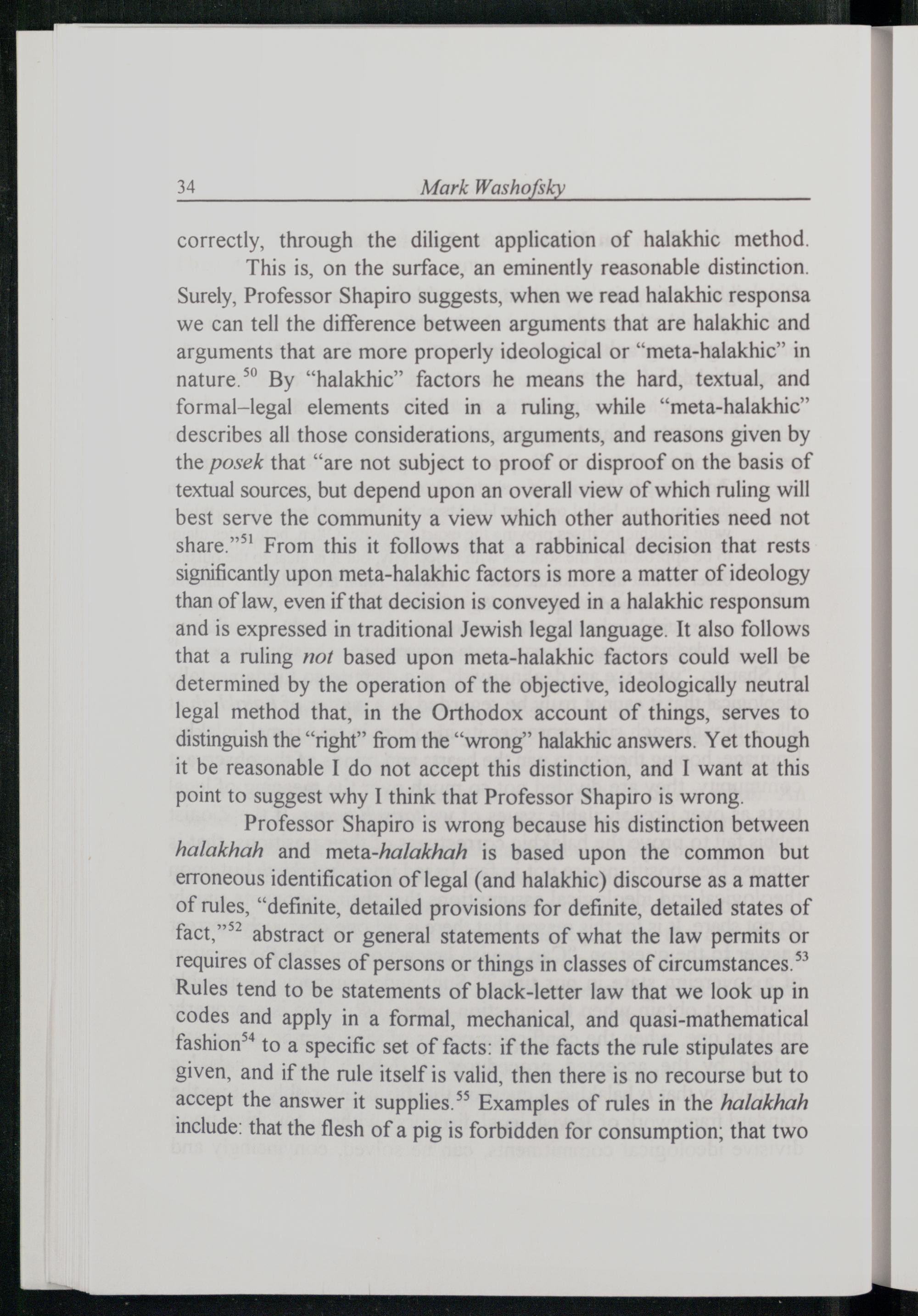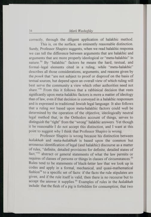 correctly, through the diligent application of halakhic method. This is, on the surface, an eminently reasonable distinction. Surely, Professor Shapiro suggests, when we read halakhic responsa we can tell the difference between arguments that are halakhic and arguments that are more properly ideological or“meta-halakhic” in nature.’ By“halakhic” factors he means the hard, textual, and formal-legal elements cited in a ruling, while“meta-halakhic” describes all those considerations, arguments, and reasons given by the posek that“are not subject to proof or disproof on the basis of textual sources, but depend upon an overall view of which ruling will best serve the community a view which other authorities need not share.” From this it follows that a rabbinical decision that rests significantly upon meta-halakhic factors is more a matter of ideology than of law, even if that decision is conveyed in a halakhic responsum and is expressed in traditional Jewish legal language. It also follows that a ruling not based upon meta-halakhic factors could well be determined by the operation of the objective, ideologically neutral legal method that, in the Orthodox account of things, serves to distinguish the“right” from the“wrong” halakhic answers. Yet though it be reasonable I do not accept this distinction, and I want at this point to suggest why I think that Professor Shapiro is wrong. Professor Shapiro is wrong because his distinction between halakhah and meta-halakhah is based upon the common but erroneous identification of legal(and halakhic) discourse as a matter of rules,“definite, detailed provisions for definite, detailed states of fact,”** abstract or general statements of what the law permits or requires of classes of persons or things in classes of circumstances. Rules tend to be statements of black-letter law that we look up in codes and apply in a formal, mechanical, and quasi-mathematical fashion® to a specific set of facts: if the facts the rule stipulates are given, and if the rule itself is valid, then there is no recourse but to accept the answer it supplies.*> Examples of rules in the halakhah include: that the flesh of a pig is forbidden for consumption; that two