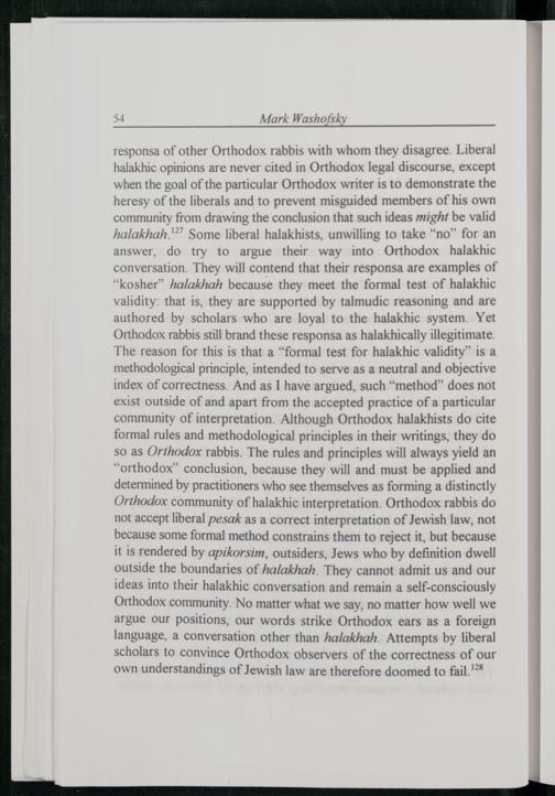 responsa of other Orthodox rabbis with whom they disagree. Liberal halakhic opinions are never cited in Orthodox legal discourse, except when the goal of the particular Orthodox writer is to demonstrate the heresy of the liberals and to prevent misguided members of his own community from drawing the conclusion that such ideas might be valid halakhah.'” Some liberal halakhists, unwilling to take“no” for an answer, do try to argue their way into Orthodox halakhic conversation. They will contend that their responsa are examples of “kosher” halakhah because they meet the formal test of halakhic validity: that is, they are supported by talmudic reasoning and are authored by scholars who are loyal to the halakhic system. Yet Orthodox rabbis still brand these responsa as halakhically illegitimate. The reason for this is that a“formal test for halakhic validity” is a methodological principle, intended to serve as a neutral and objective index of correctness. And as I have argued, such“method” does not exist outside of and apart from the accepted practice of a particular community of interpretation. Although Orthodox halakhists do cite formal rules and methodological principles in their writings, they do so as Orthodox rabbis. The rules and principles will always yield an “orthodox” conclusion, because they will and must be applied and determined by practitioners who see themselves as forming a distinctly Orthodox community of halakhic interpretation. Orthodox rabbis do not accept liberal pesak as a correct interpretation of Jewish law, not because some formal method constrains them to reject it, but because it is rendered by apikorsim, outsiders, Jews who by definition dwell outside the boundaries of halakhah. They cannot admit us and our ideas into their halakhic conversation and remain a self-consciously Orthodox community. No matter what we say, no matter how well we argue our positions, our words strike Orthodox ears as a foreign language, a conversation other than halakhah. Attempts by liberal scholars to convince Orthodox observers of the correctness of our own understandings of Jewish law are therefore doomed to fail'?*