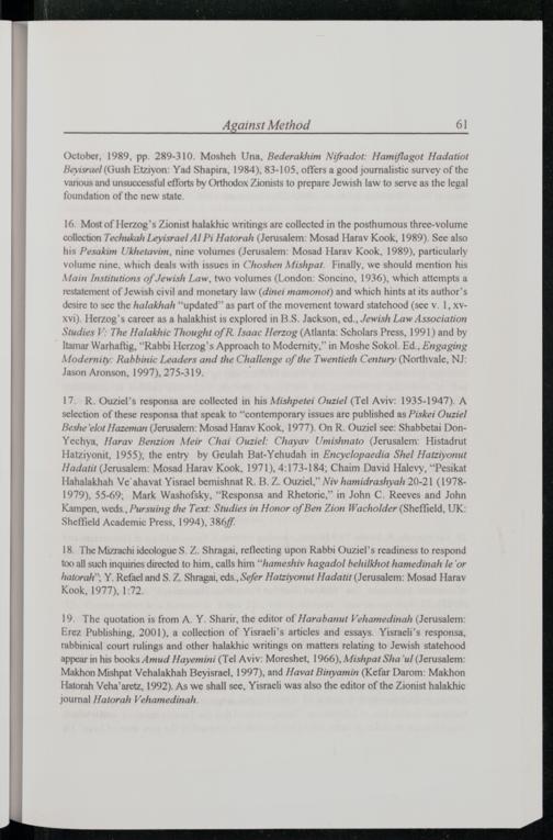 17. R. Ouziel’s responsa are collected in his Mishpetei Ouziel(Tel Aviv : 1935-1947). A selection of these responsa that speak to“contemporary issues are published as Piskei Ouziel Beshe'elot Hazeman(Jerusalem : Mosad Harav Kook, 1977). On R. Ouziel see: Shabbetai DonYechya, Harav Benzion Meir Chai Ouziel: Chayav Umishnato(Jerusalem : Histadrut Hatziyonit, 1955), the entry by Geulah Bat-Yehudah in Encyclopaedia Shel Hatziyonut Hadatit(Jerusalem : Mosad Harav Kook, 1971), 4:173-184; Chaim David Halevy,“Pesikat Hahalakhah Ve ahavat Yisrael bemishnat R. B. Z. Ouziel,” Niv hamidrashyah 20-21(19781979), 55-69; Mark Washofsky,“Responsa and Rhetoric,” in John C. Reeves and John Kampen, weds., Pursuing the Text: Studies in Honor of Ben Zion Wacholder(Sheffield, UK : Sheffield Academic Press, 1994), 386/f. 18. The Mizrachi ideologue S. Z. Shragai, reflecting upon Rabbi Ouziel’s readiness to respond too all such inquiries directed to him, calls him“hameshiv hagadol behilkhot hamedinah le or hatorah™, Y. Refael and S. Z.. Shragai, eds., Sefer Hatziyonut Hadatit(Jerusalem : Mosad Harav Kook, 1977), 1:72.