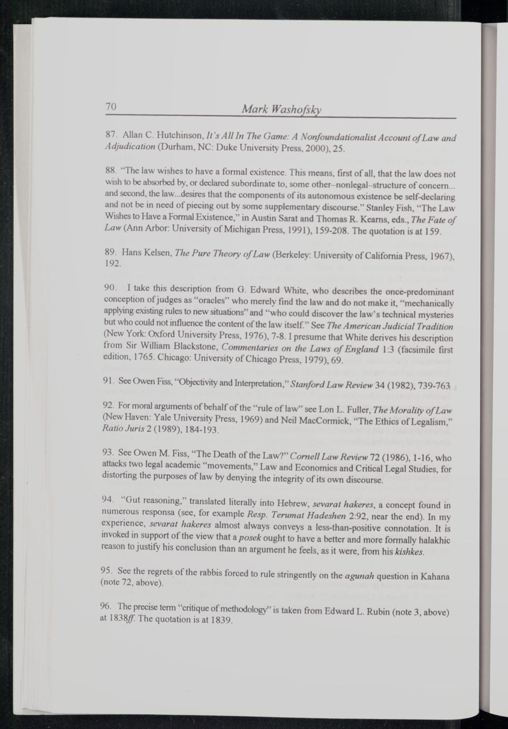 88.“The law wishes to have a formal existence. This means, first of all, that the law does not wish to be absorbed by, or declared subordinate to, some other nonlegal-structure of concern and second, the law...desires that the components of its autonomous existence be self-declaring and not be in need of piecing out by some supplementary discourse.” Stanley Fish ,“The Law Wishes to Have a Formal Existence,” in Austin Sarat and Thomas R. Kearns. eds., The Fate of Law(Ann Arbor : University of Michigan Press , 1991), 159-208. The quotation is at 159