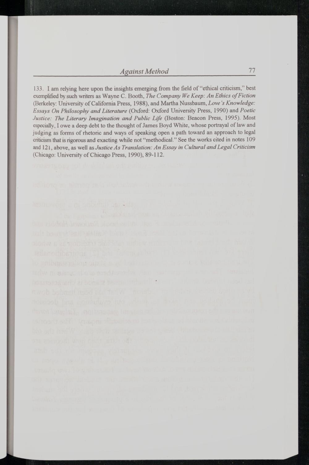 133. I am relying here upon the insights emerging from the field of“ethical criticism,” best exemplified by such writers as Wayne C. Booth , The Company We Keep: An Ethics of Fiction (Berkeley : University of California Press , 1988), and Martha Nussbaum , Love's Knowledge: Essays On Philosophy and Literature(Oxford : Oxford University Press , 1990) and Poetic Justice: The Literary Imagination and Public Life(Boston : Beacon Press , 1995). Most especially, I owe a deep debt to the thought of James Boyd White , whose portrayal of law and judging as forms of rhetoric and ways of speaking open a path toward an approach to legal criticism that is rigorous and exacting while not“methodical.” See the works cited in notes 109 and 121, above, as well as Justice As Translation: An Essay in Cultural and Legal Criticism (Chicago : University of Chicago Press , 1990), 89-112.