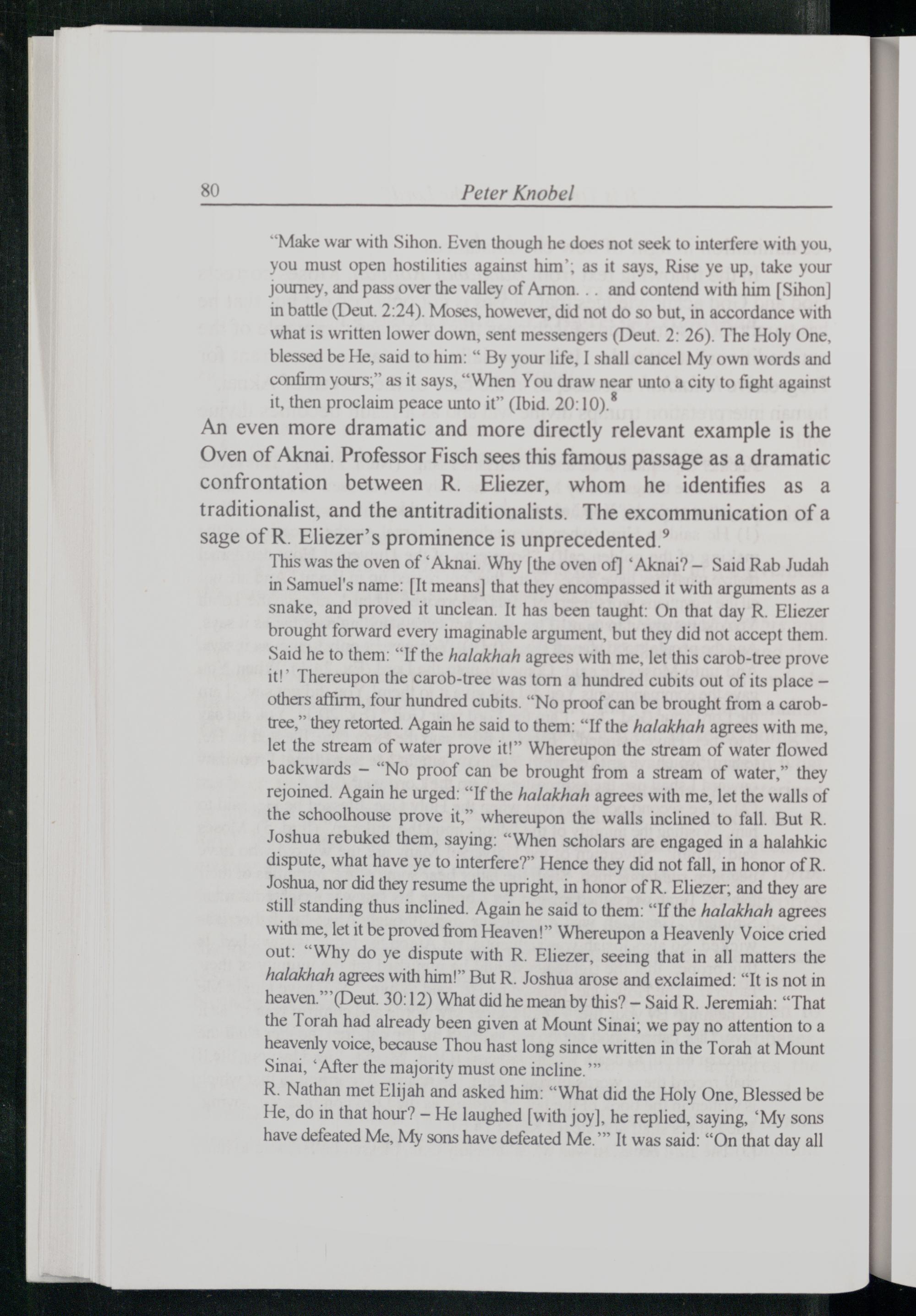 An even more dramatic and more directly relevant example is the Oven of Aknai. Professor Fisch sees this famous passage as a dramatic confrontation between R. Eliezer, whom he identifies as a traditionalist, and the antitraditionalists. The excommunication of a