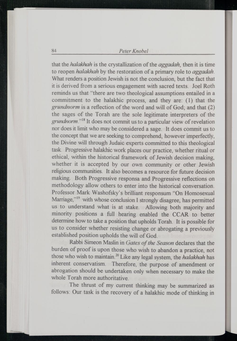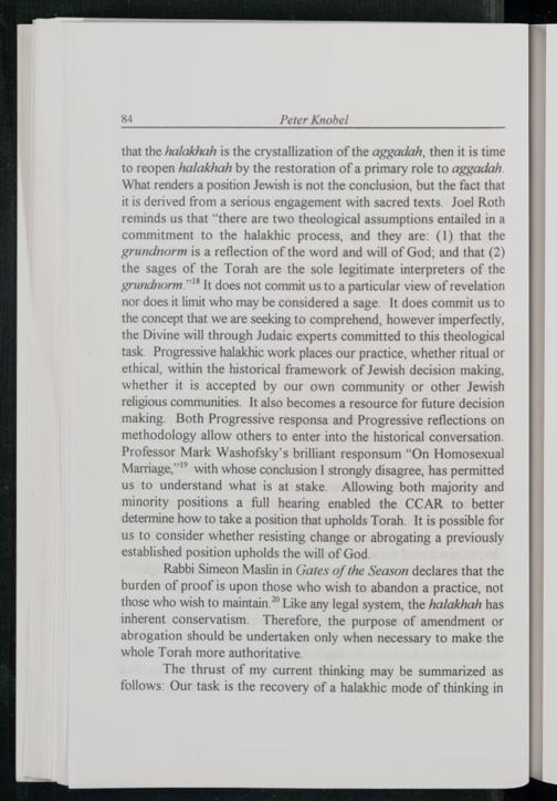 that the halakhah is the crystallization of the aggadah, then it is time to reopen halakhah by the restoration of a primary role to aggadah What renders a position Jewish is not the conclusion, but the fact that it 1s derived from a serious engagement with sacred texts. Joel Roth reminds us that“there are two theological assumptions entailed in a commitment to the halakhic process, and they are:(1) that the grundnorm is a reflection of the word and will of God ; and that(2) the sages of the Torah are the sole legitimate interpreters of the grundnorm.”'® It does not commit us to a particular view of revelation nor does it limit who may be considered a sage. It does commit us to the concept that we are seeking to comprehend, however imperfectly, the Divine will through Judaic experts committed to this theological task. Progressive halakhic work places our practice, whether ritual or ethical, within the historical framework of Jewish decision making, whether it is accepted by our own community or other Jewish religious communities. It also becomes a resource for future decision making. Both Progressive responsa and Progressive reflections on methodology allow others to enter into the historical conversation. Professor Mark Washofsky’s brilliant responsum“On Homosexual Marriage,”"” with whose conclusion I strongly disagree, has permitted us to understand what is at stake. Allowing both majority and minority positions a full hearing enabled the CCAR to better determine how to take a position that upholds Torah . It is possible for us to consider whether resisting change or abrogating a previously established position upholds the will of God .