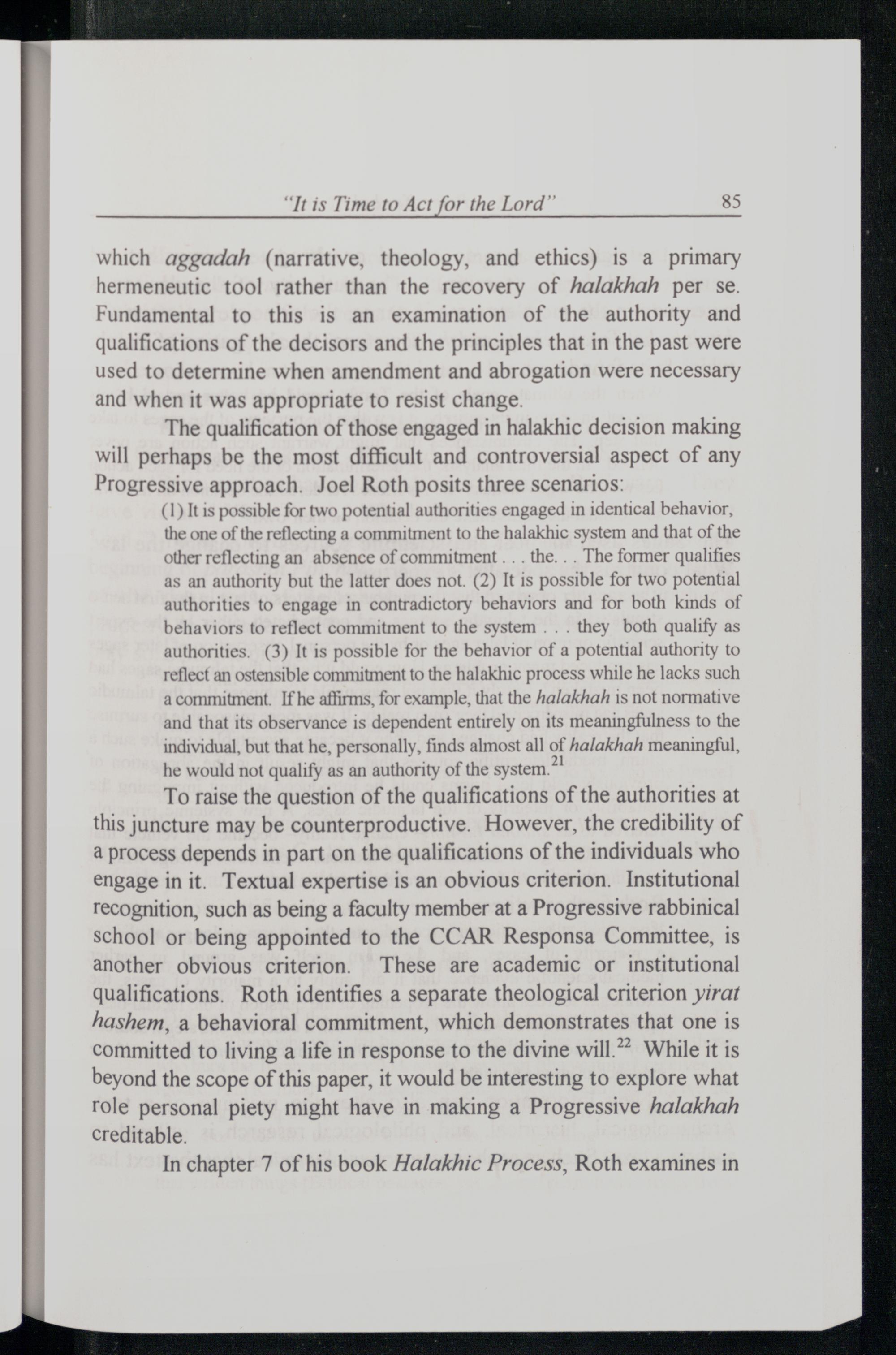 To raise the question of the qualifications of the authorities at this juncture may be counterproductive. However, the credibility of a process depends in part on the qualifications of the individuals who engage in it. Textual expertise is an obvious criterion. Institutional recognition, such as being a faculty member at a Progressive rabbinical school or being appointed to the CCAR Responsa Committee, is another obvious criterion. These are academic or institutional qualifications. Roth identifies a separate theological criterion yirat hashem, a behavioral commitment, which demonstrates that one is committed to living a life in response to the divine will.” While it is beyond the scope of this paper, it would be interesting to explore what role personal piety might have in making a Progressive halakhah creditable.
