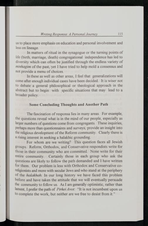 The fascination of responsa lies in many areas. For example, the questions reveal what is in the mind of our people, especially as larger numbers of questions come from congregants. These inquiries, perhaps more than questionnaires and surveys, provide an insight into the religious development of the Reform community. Clearly there is a rising interest in seeking a halakhic grounding.
