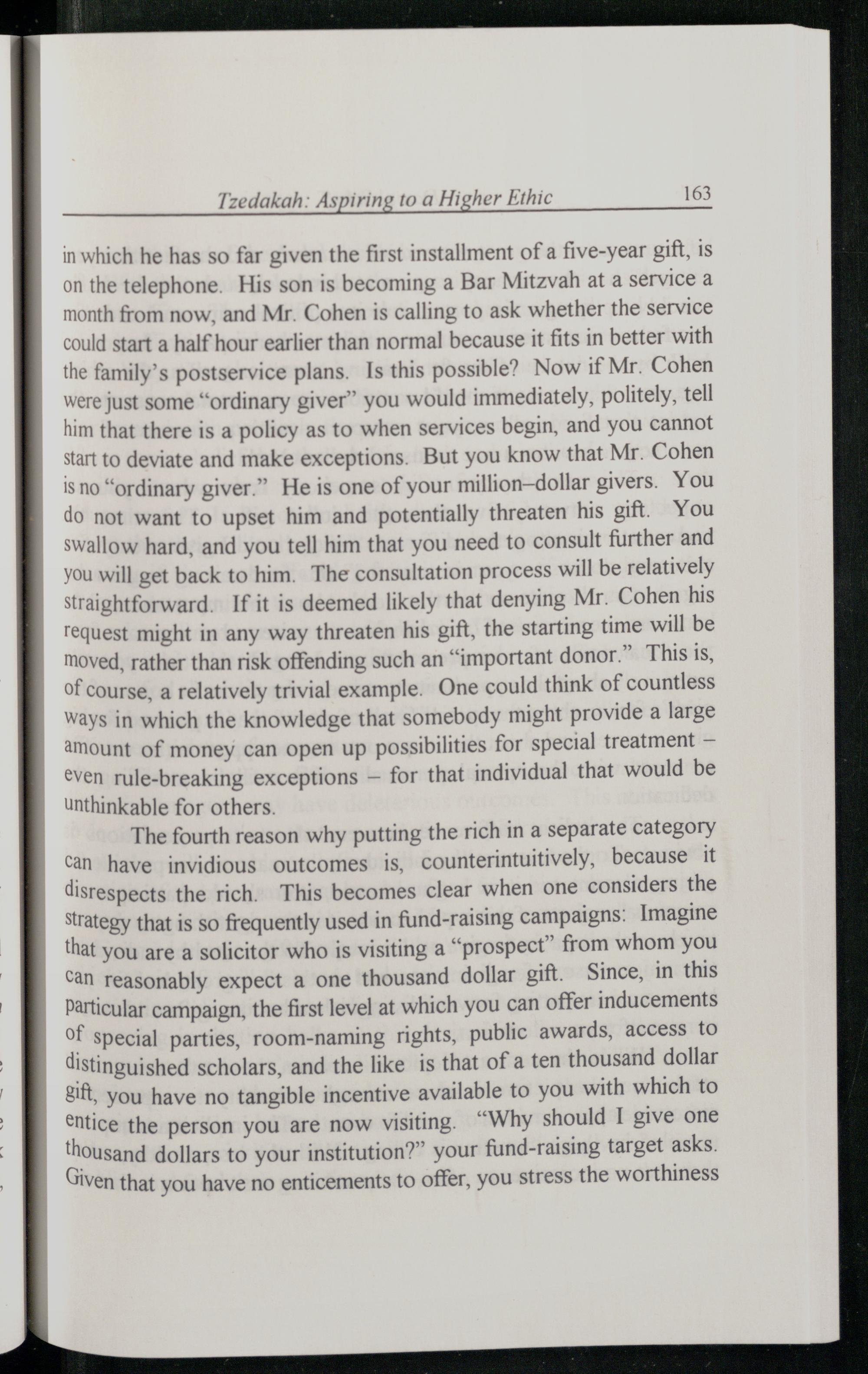 in which he has so far given the first installment of a five-year gift, is on the telephone. His son is becoming a Bar Mitzvah at a service a month from now, and Mr. Cohen is calling to ask whether the service could start a half hour earlier than normal because it fits in better with the family’s postservice plans. Is this possible? Now if Mr. Cohen were just some“ordinary giver” you would immediately, politely, tell him that there is a policy as to when services begin, and you cannot start to deviate and make exceptions. But you know that Mr. Cohen is no“ordinary giver.” He is one of your million—dollar givers. You do not want to upset him and potentially threaten his gift. You swallow hard, and you tell him that you need to consult further and you will get back to him. The consultation process will be relatively straightforward. If it is deemed likely that denying Mr. Cohen his request might in any way threaten his gift, the starting time will be moved, rather than risk offending such an“important donor.” This is, of course, a relatively trivial example. One could think of countless ways in which the knowledge that somebody might provide a large amount of money can open up possibilities for special treatment— even rule-breaking exceptions— for that individual that would be unthinkable for others.