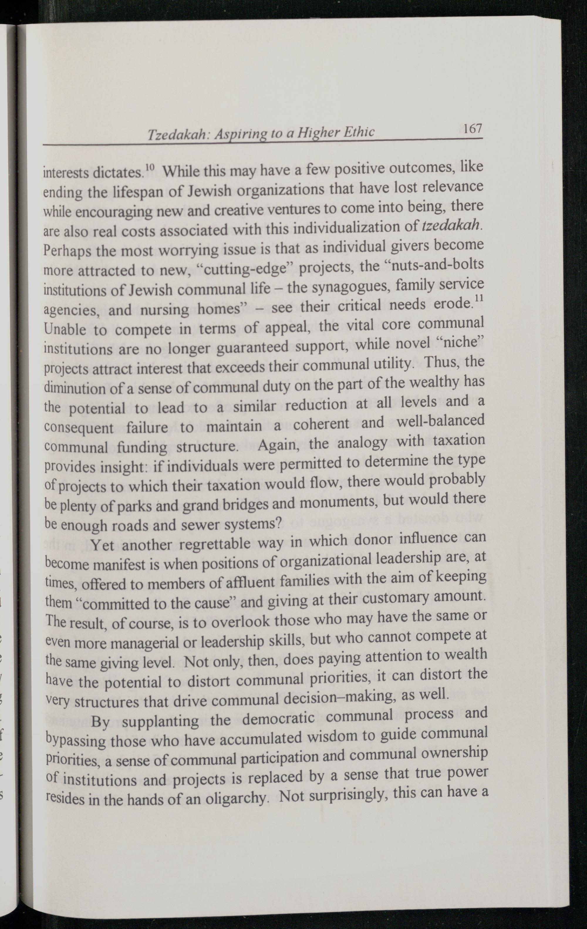 interests dictates." While this may have a few positive outcomes, like ending the lifespan of Jewish organizations that have lost relevance while encouraging new and creative ventures to come into being, there are also real costs associated with this individualization of 1zedakah. Perhaps the most worrying issue is that as individual givers become more attracted to new,“cutting-edge” projects, the“nuts-and-bolts institutions of Jewish communal life— the synagogues, family service agencies, and nursing homes”— see their critical needs erode." Unable to compete in terms of appeal, the vital core communal institutions are no longer guaranteed support, while novel“niche” projects attract interest that exceeds their communal utility. Thus, the diminution of a sense of communal duty on the part of the wealthy has the potential to lead to a similar reduction at all levels and a consequent failure to maintain a coherent and well-balanced communal funding structure. Again, the analogy with taxation provides insight: if individuals were permitted to determine the type of projects to which their taxation would flow, there would probably be plenty of parks and grand bridges and monuments, but would there be enough roads and sewer systems?