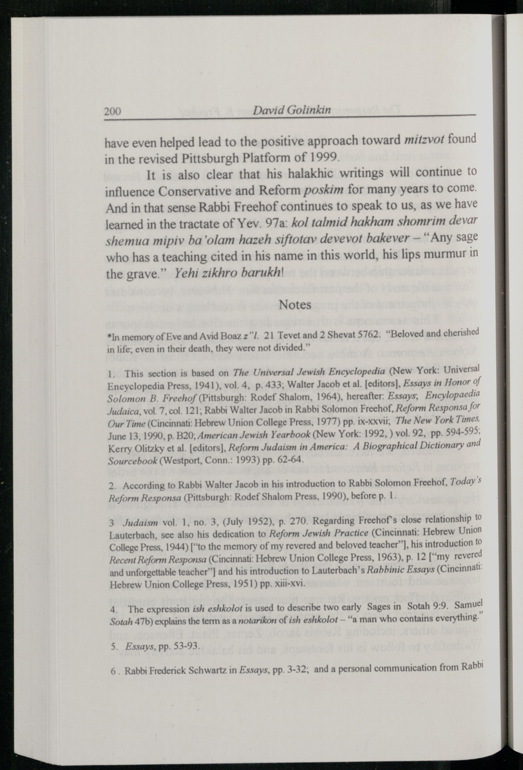 I. This section is based on The Universal Jewish Encyclopedia(New York : Universal Encyclopedia Press, 1941), vol. 4, p. 433; Walter Jacob et al.[editors], Essays in Honor of Solomon B. Freehof(Pittsburgh : Rodef Shalom, 1964), hereafter: Essays, Encylopaedia Judaica . vol. 7, col. 121; Rabbi Walter Jacob in Rabbi Solomon Freehof , Reform Responsa for Our Time(Cincinnati : Hebrew Union College Press , 1977) pp. ix-xxvii,; The New York Times , June 13, 1990, p. B20, American Jewish Yearbook(New York : 1992,) vol. 92, pp. 594-595, Kerry Olitzky et al.[editors], Reform Judaism in America: A Biographical Dictionary and Sourcebook(Westport , Conn. : 1993) pp. 62-64.