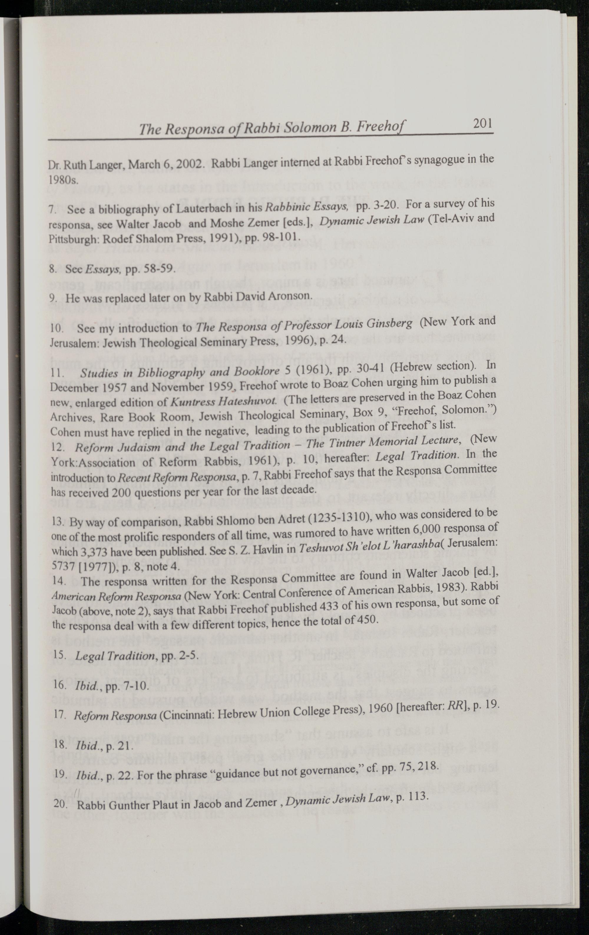 13. By way of comparison, Rabbi Shlomo ben Adret (1235-1310), who was considered to be one of the most prolific responders of all time, was rumored to have written 6,000 responsa of which 3,373 have been published. See S. Z. Havlin in Teshuvot Sh elot L"harashba( Jerusalem : 5737[1977]), p. 8, note 4. 14. The responsa written for the Responsa Committee are found in Walter Jacob [ed.], American Reform Responsa(New York : Central Conference of American Rabbis, 1983). Rabbi Jacob (above, note 2), says that Rabbi Freehof published 433 of his own responsa, but some of the responsa deal with a few different topics, hence the total of 450.