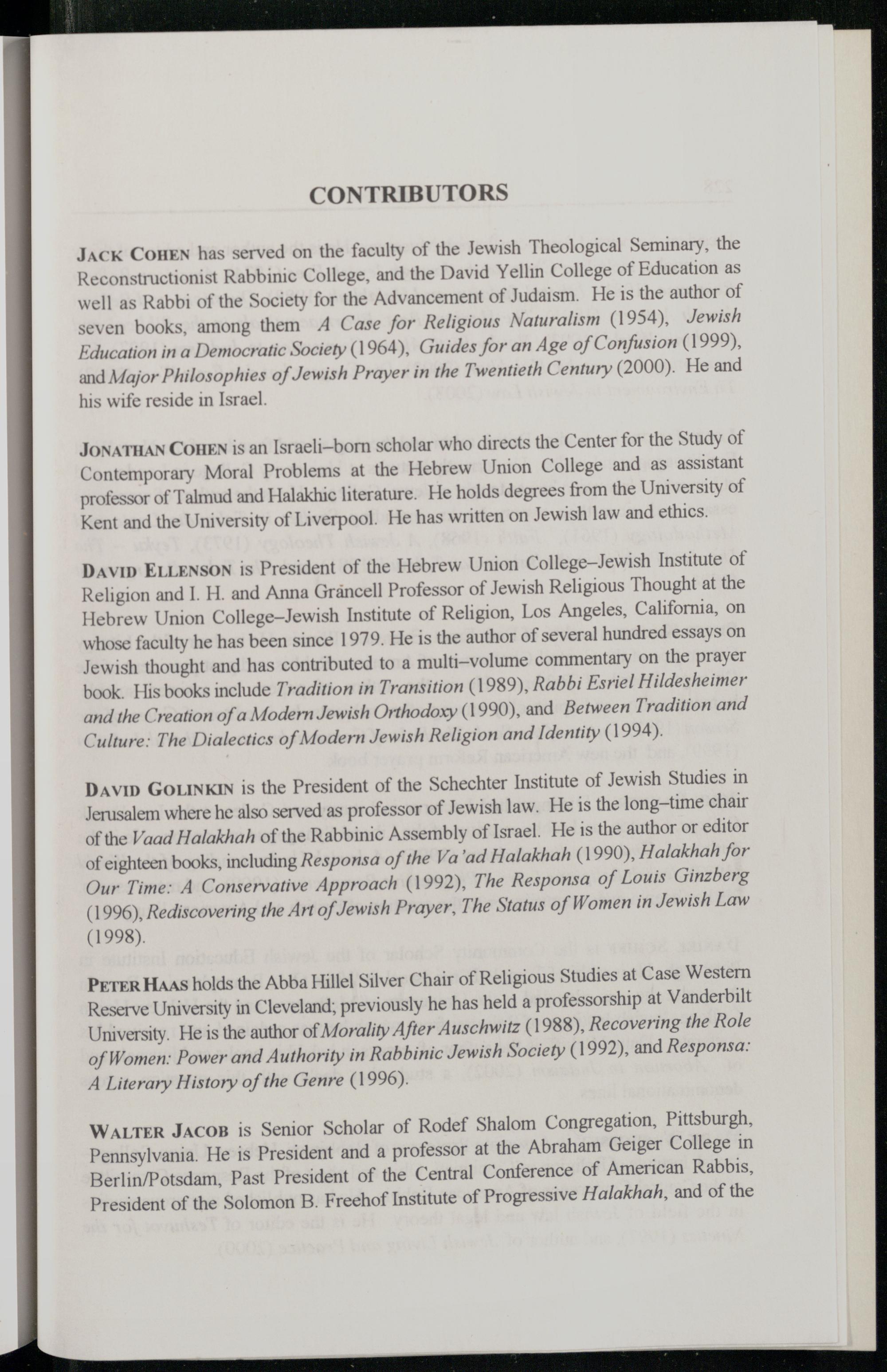 JACK COHEN has served on the faculty of the Jewish Theological Seminary , the Reconstructionist Rabbinic College, and the David Yellin College of Education as well as Rabbi of the Society for the Advancement of Judaism. He is the author of seven books, among them A Case for Religious Naturalism(1954), Jewish Education in a Democratic Society(1964), Guides for an Age of Confusion(1999), and Major Philosophies of Jewish Prayer in the Twentieth Century(2000). He and his wife reside in Israel .