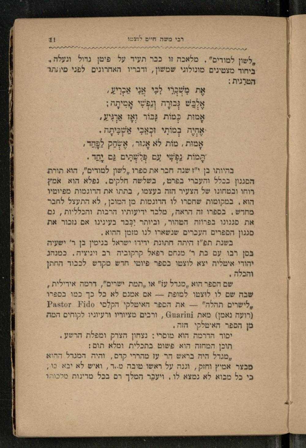 רבי משה חיים לוצטו 41 יי ,לשון למודים". מלאכה זו כבר תעיר על פימן גדול ונעלה. ביחוד מצטינים מונולוגי שמשון, ודבריו האחרונים לפני מיוזתר הטרגית: אֶת מִשברי לַבִּי אָנִי אַכְרִיעַ, לבט ְבוּרֶה ונפשי אָמִיתָה; אָמוּת כָּמות גְּבור וְאֶז אַרְִיע, אַחַיָה בְמותי וּכְאָבִי אַשְבִּיתָה. אָמוּת, מות לא אָנוּר, אַטְחַק לַפֶחַד, תָמות נפשִי עם פְּלְשְתִים גַם יָתַד. בהיותו בן י"ז שנה חבר את ספרו 1 למודים", הוא תורת. הסגנון בכלל והעברי בפרם, בשלשה חלקים. נפלא הוא אמץ רוחו ובטחונו של הצעיר הזה בעצמו, בת את הרוגמות מפיומיו הוא. במקומות שחפרו לו הדוגמות מן המוכן, לא התעצל לחבר מחדש. בספרו זה הראה, מלבד ידיעותיו הרבות והכלליות, גם את סגנונו בפרוזה הטהור, וביותר יִכֶּבד בעינינו אם נזכור את סגנון הספרים העברים שנשארו לנו מזמן ההוא. בשנת תפ"ז היתה חתונת ירירו ישראל בנימין בן ר' ישעיה בסן רבו עם בת ר' מנחם רפאל קרקוביה רב ויניציה. כמנהג יהודי אימליה יצא לוצטו בספר פיוטי חרש מקדש לכבוד החתן והכלה, שם הספר הוא, מגדל עו" או ,תמת ישרים", דרמה אירילית, שבה שם לו לוצ טו למופת-- אם אמנם לא כל כך כמו בספרו ,לישרים תהלה"-- את הספר האיטלקי הקלםיPastor Fido (רועה נאמן) מאת Guarini, ורבים מציוריו ורעיוניו לקוחים המה מן הספר האיטלקי הוה. יפוד הדרמה הוא מוסרי: נצחון הצדק ומפלת הרשו תוכן המחוה הוא פשום בתכלית ומלא תום: ,מגדל היה בראש הר עז מהררי קדם, והיה המגדל ההוא מבצר אמיץ וחזק, וגנה על ראשו טובה מ..ד, ואיש לא יבא כו, בי כל מבוא לא נמצא לא, יעבר המלך רם בכל מרינות מלכוהו