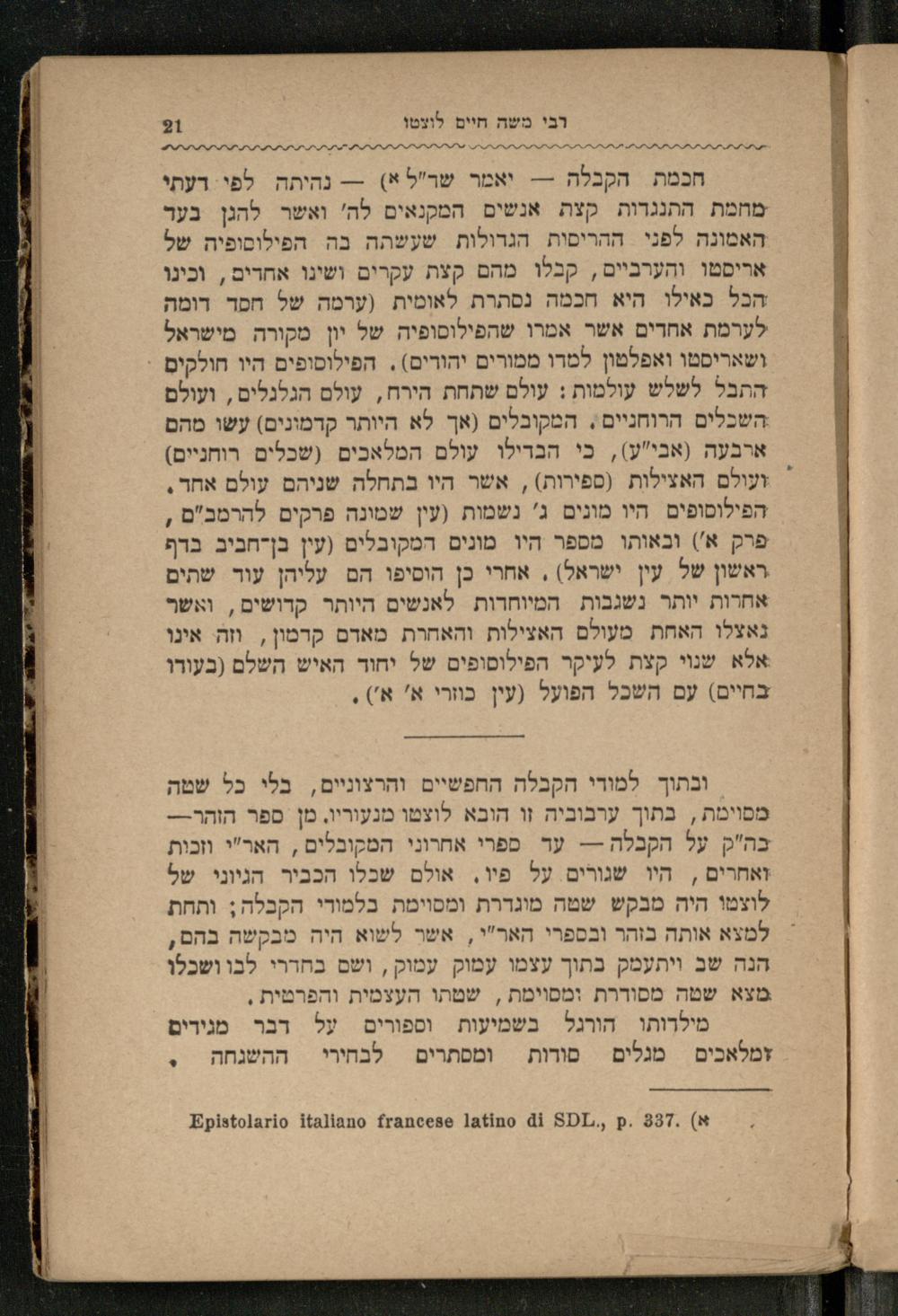 רבי משה חיים לוצטו הכמת הקבלה-- יאמר שר"לא)-- נהיתה לפי רעתי מזמת התנגדות קצת אנשים המקנאים לה' ואשר להגן בער האמונה לפני ההריסות הגרולות שעשתה בה הפילוסופיה של אריסטו והערביים, קבלו מהם קצת עקרים ושינו אחרים, וכינו הבל כאילו היא חכמה נסתרת לאומית(ערמה של חפד דומה לערמת אחרים אשר אמרו שהפילוסופיה של יון מקורה מישראל ושאריסטו ואפלטון למדו ממורים יהורים).. הפילוסופים היו חולקים התבל לשלש עולמות: עולם שתחת הירח, עולם הגלנלים, ועולם השכלים הרוחניים. המקובלים(אך לא היותר קדמונים) עשו מהם ארבעה(אבי"ע), כי הבדילו עולם המלאכים(שכלים רוחניים) זעולם האצילות(ספירות), אשר היו בתחלה שניהם עולם אחד, הפילוסופים היו מונים ג' נשמות(עין שמונה פרקים להרמב"ם, פרק א') ובאותו מספר היו מונים המקובלים(עין בןחביב בדף ראשון של עין ישראל), אחרי כן הוסיפו הם עליהן עוד שתים אחרות יותר נשגבות המיוחדות לאנשים היותר קדושים, ואשר נאצלו האחת מעולם האצילות והאחרת מאדם קדמון, וזה אינו אלא שנוי קצת לעיקר הפילוסופים של יחור האיש השלם(בעורו בחיים) עם השכל הפועל(עין כוזרי א' א'),