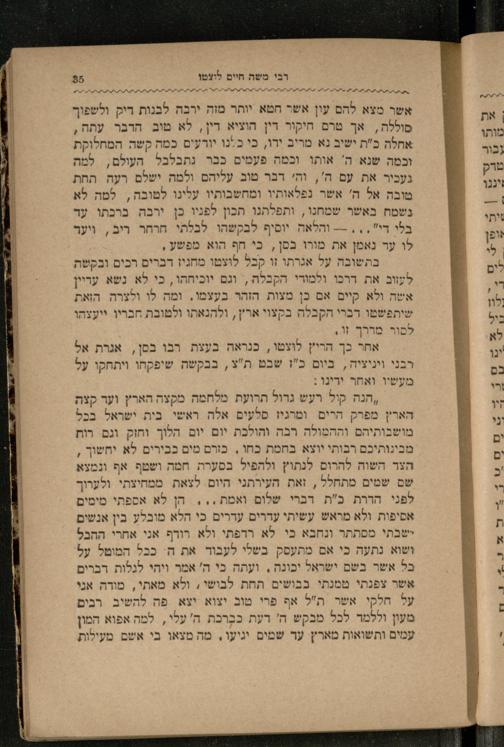 ,הנה קול רעש גרול תרועת מלחמה מקצה הארץ ועד קצה הארץ מפרק הרים ומרגיז סלעים אלה ראשי בית ישראל בכל מושבותיהם וההמולה רבה והולכת יום יום הלוך וחזק וגם רות מבינותיכם רבותי יוצא בחמת כחו. כזרם מים כבירים לא יחשוך, הצר השוה להרום לנתוץ ולהפיל בסערה חמה ושטף אף ונמצא שם שמים מתחלל, זאת העירתני היום. לצאת ממחיצתי ולערוך לפני הדרת כ"ת דברי שלום ואמת,,, הן לא אספתי מימים אסיפות ולא מראש עשיתי עדרים עררים כי הלא מובלע בין אנשים ישבתי מסתתר ונחבא בי לא ררפתי ולא רודף אני אחרי ההבל ושוא נתעה כי אם מתעסק בשלי לעבוד את ה: בכל המוטל על בל אשר בשם ישראל יכונה, ועהה בי ה' אמר ויהי לגלות רברים אשר צפנתי ממנתי בבושים תחת לבושי, ולא מאתי, מודה אני על חלקי אשר ת"ל אף פרי טוב יצוא יצא פה להשיב רבים מעון וללמר לכל מבקש ה' דעת כבֶרכת ה' עלי,, למה אפוא המון עמים ותשואות מארץ עד שמים יגיעו, מה מצאו בי אשם מעילות