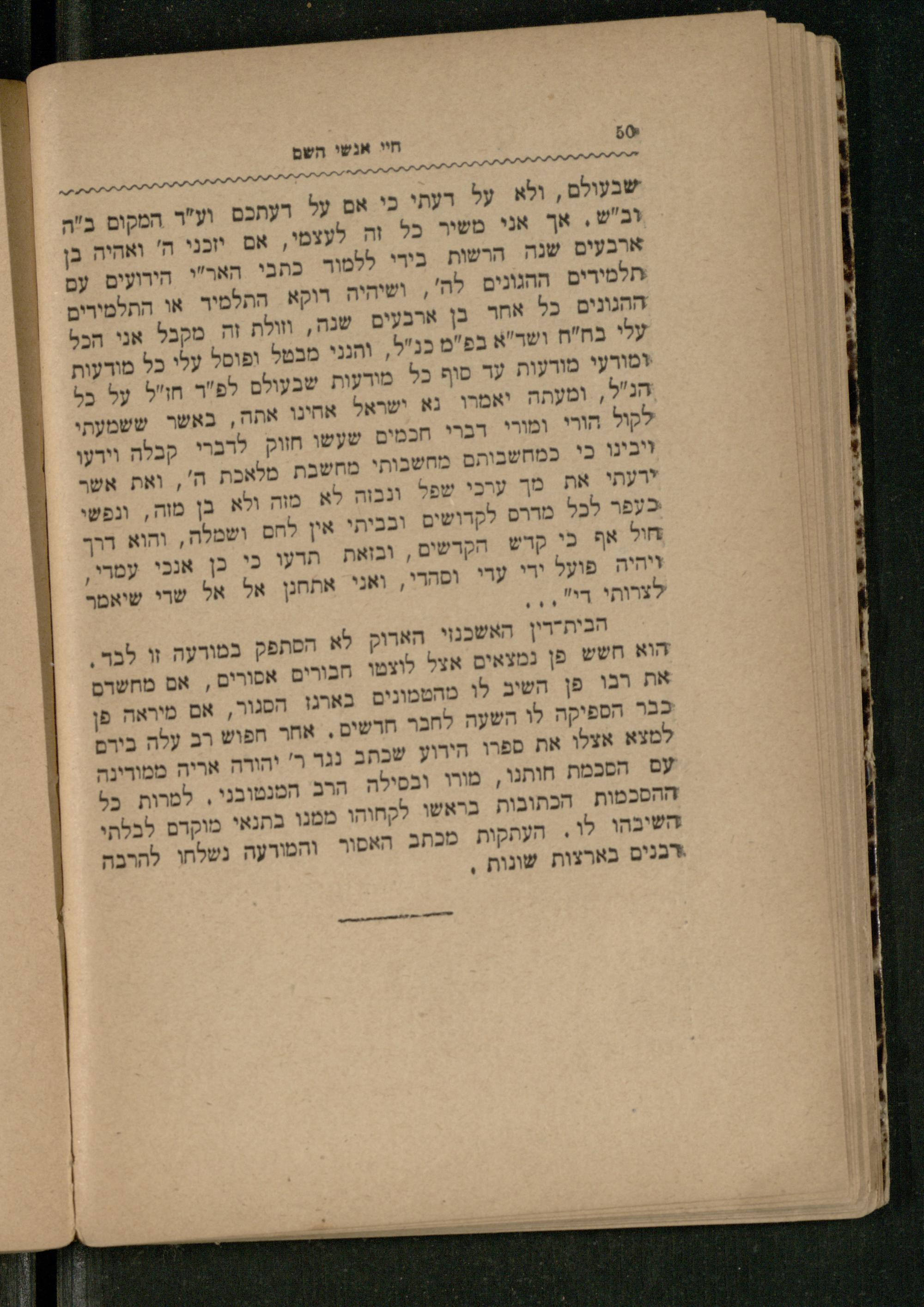 שבעולם, ולא על דעתי כי אם על דעתכם וע"ד המקום ב"ה וב"ש, אך אני משיר כל זה לעצמי, אם יזכני ה' ואהיה בן ארבעים שנה הרשות בידי ללמוד כתבי האר"י הידועים עם תלמידים ההגונים לה', ושיהיה דוקא התלמיד או התלמידים ההגונים כל אחד בן ארבעים שנה, וזולת זה מקבל אני הכל עלי בח"ח ושד"א בפ"מ כנ"ל, והנני מבטל ופוסל עלי כל מודעות ומודעי מודעות עד סוף כל מודעות שבעולס לפ"ד חז"ל על כל הנ"ל, ומעתה יאמרו נא ישראל אחינו אתה, באשר ששמעתי לקול הורי ומורי דברי חכמים שעשו חזוק לדברי קבלה וידעו ויבינו כי כמחשבותם מחשבותי מחשבת מלאכת ה', ואת אשר ידעתי את מך ערכי שפל ונבזה לא מזה ולא בן מזה, ונפשי כעפר לכל מדרס לקדושים ובביתי אין לחם ושמלה, והוא דרך חול אף כי קדש הקדשים, ובזאת תדעו כי כן אנכי עמדי, לצרותי די"... ויהיה פועל ידי עדי וסהרי, ואני אתחנן אל אל שדי שיאמר