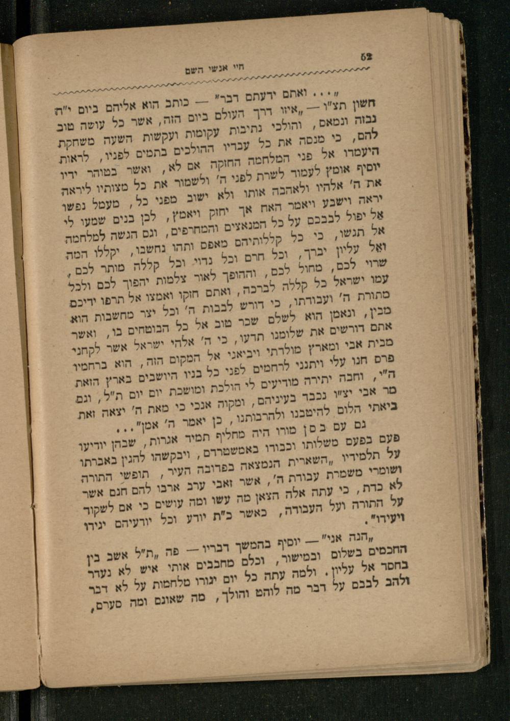 יי.י. ואתם ירעתם רברי"= כותב הוא אליהם ביום י"ת חשון תצ"ו== ואיוו. דרך. העולם כיום הזה, אשר כל עושה טוב נבזה ונמאם, והולכי נתיבות עקומות ועקשות השעה משחקת להם, כי יפה את כל עבריו. ההולכים בתמים לפניו, לראות היעמרו אל פני המלחמה החוקה אם לא, ואשר בטוהר ירין יוםיף אומץ לעמור לשרת לפני ה' ולשמור את כל מצותיו ליראה את ה' אלהיו ולאהבה אותו ולא יוב מפני בל, מעמל נפשו יראה וישבע ויאמר האח אך יחוק ויאמץ, לכן בנים שמעו לי אל יפול לבבבם על כל המנאצים יהמחרפים, וגם הגשה למלחמה אל הגשו, בי כל קללוהיהם לאפס ותהו גחשבו, יקללו המת ואֶל עליון יברך, וכל חרם וכל נדוי- ובל קללה מותר לכם, שרוי לכם, מחול לכם, וההופך לאור. צלמות יהפוך לכם ולכל עמו ישראל בל קללה לברבה, ואתם חוקו ואמצו אל תרפו יריכם סתורת ה' יעבודתו,; כי דורש לבבות ה' וכל יצר מחשבות הוא מב'ן, ונאמן הוא לשלם שבר טוב אל כל הבוטחים בו, ואשר אתם דורשים את שלומנו תדעו, כי ה' אלהי ישראל אשר לקחני מבית אבי ומארץ מולדתי ויביאני. אל המקום הוה, הוא ברחמיו פרם חנו עלי ויתנני לרחמים לפני בל בניו היושבים בארץ הואת ה"י, וחבה יתירה מודיעים ל הולכת ומושבת יום יום ת"ל, וגם בר אבי יציין נכבד בעיניהם, ומקוה אנכי כי מאת ה' יצאה ואת ביאתי הלום להיטבנו ולהרבותנו, כן יאמר ה' אכן",.,