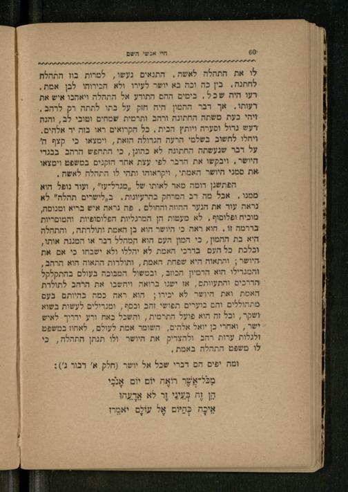 י60 חיי אנשי השם "יק ית ילט שת תיתשת 22 ל יו ה לו את התהלה לאשה. התנאים נעשו, למרות בוו התהלת לחתנה. בין כה ובה בא יושר לעירו ולא הכירוהו לבן אמת. רעו היה שבל, בימים ההם התורע אל התהלה ויאהבו איש את רעותו. אך רבר ההמון היה חוק על בתו לתתה רק לרהב, זיהי בעת משתה החתונה ורהב ותרמית שמחים וטובי לב, והנה דעש גדול ופערה ויותץ הבית. כל הקרואים ראו בזה יר אלהים. ויחלו לחשוב בשלמי הרעה הגדולה הואת, וימצאו כי קצף ה' על דבר שנעשתה החתונה לא בהוגן, בי התחפש הרהב בבגרי היישר, ויבקשו את הרבר לפי עצת אחר הוקנים במשפט וימצאו את סמני היושר האמתי, ויקראוהו ותהי לו התהלה לאשה. הפתשגן דומה מאר לאותו של, מגדל-עז", ועור נופל הוא ממנו. אבל מה רב המרחק בהרעיונות. ב,לישרים תהלה" לא נראה עוד את הנער ההוזה והחולם. פה נראה איש בריא ומנוסה, מוכיח ופלוסוף. לא מעטות הן המרגליות הפלוסופיות והמוסריות בררמה זו, הוא ראה כי היושר הוא בן האמת ותולדתה, והתהלה היא בת ההמון, כי המון העם הוא המהלל דבר או המגנה אותו, ובלכת כל העם בררכי האמת לא יהללו ולא ישבחו כי אם את היושר; והתאוה היא שפחת האמת, ותולרות התאוה הוא הרהב, והמגרילו הוא הרמיון הכוזב, ובמשול המבוכה בעולם בהתקלקל הדרכים והתעוותם, אז ישגו ברואה ויחשבו את הרהב לתולרת האמת ואת היושר לא יכירו; הוא ראה כמה בהיותם בעם מתהוללים והם בוערים תפושי זהב וכסף, ומגדילים לעשות בשוא ושקר, ובל זה הוא פועל התרמית, והשכל כאח ורע ירריך לאיש ישר, ואחרי כן יואל אלהים, השומר אמת לעולם, לאחוז במשפמ ולגלות. ערות רהב ולהצדיק את היושר ולו תנתן התהלה, כי לו משפט התהלה באמת,