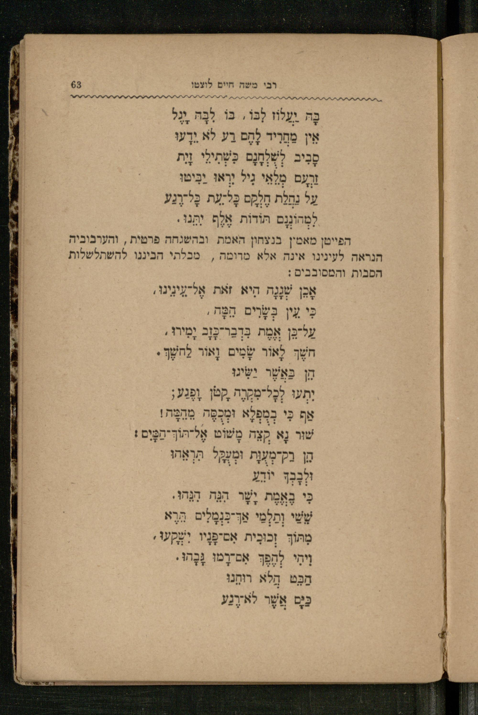 בָּה יַעֲלוֹז לִבּוֹ, בּוֹ לִבָּהּ יָגֶל אֵין מַחֲרִיד לָהֶם רַע לֹא יֵדָעוּ סָבִיב לְשְׁלְחָנָם כִּשְׁתִילֵי זָיִת זַרְעָם מְלֵאֵי גִיל יִרְאוּ יַבִּיטוּ עַל נַחֲלַת חֶלְקָם כָּל־עֵת כָּל־רֶגַע