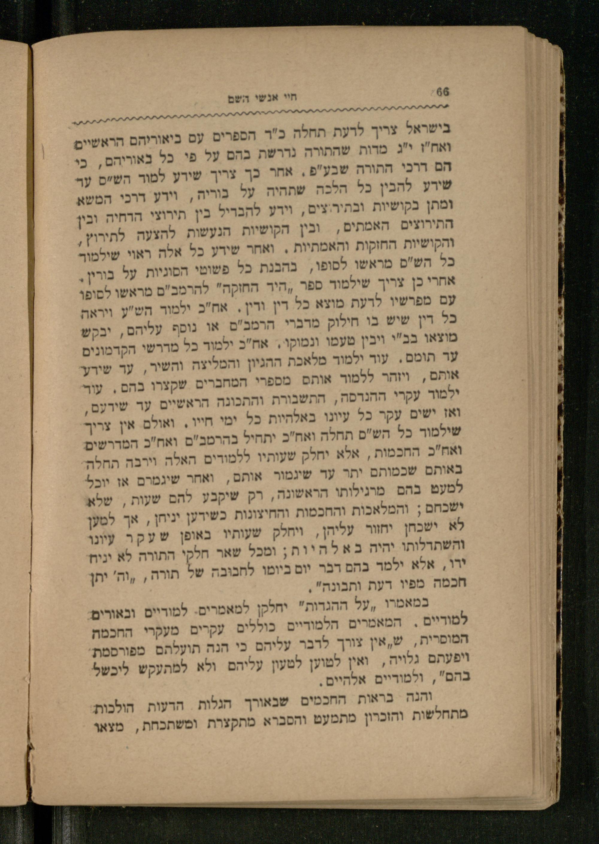 בישראל צריך לדעת תחלה כ"ר הספרים עם ביאוריהם הראשיים ואח"ז י"ג מדות שהתורה נדרשת בהם על פי כל באוריהם, כי הם דרכי התורה שבע"פ. אחר כך צריך שידע למוד הש"ס עד שידע להבין כל הלכה שתהיה על בוריה, וידע דרכי המשא ומתן בקושיות ובתירוצים, וידע להבדיל בין תירוצי הדחיה ובין התירוצים האמתים, ובין הקושיות הנעשות להצעה לתירוץ, והקושיות החזקות והאמתיות. ואחר שידע כל אלה ראוי שילמור כל הש"ס מראשו לסופו, בהבנת כל פשוטי הסוגיות על בורין, אחרי כן צריך שילמוד ספר היד החזקה" להרמב"ס מראשו לסופו עם מפרשיו לדעת מוצא כל דין ודין. אח"כ ילמוד הש"ע ויראה כל דין שיש בו חילוק מדברי הרמב"ם או נוסף עליהם, יבקש מוצאו בב"י ויבין טעמו ונמוקו. אח"כ ילמוד כל מדרשי הקדמונים עד תומם. עוד ילמוד מלאכת ההגיון והמליצה והשיר, עד שידע אותם, ויזהר ללמוד אותם מספרי המחברים שקצרו בהם. עוד ילמוד עקרי ההנדסה, התשבורת והתכונה הראשיים עד שידעם, ואז ישים עקר כל עיונו באלהיות כל ימי חייו, ואולם אין צריך שילמוד כל הש"ס תחלה ואח"כ יתחיל בהרמב"ס ואח"כ המדרשים: ואח"כ החכמות, אלא יחלק שעותיו ללמודים האלה וירבה תחלה באותם שכמותם יתר עד שיגמור אותם, ואחר שיגמרם אז יוכל למעט בהם מרגילותו הראשונה, רק שיקבע להם שעות, שלא ישכחם; והמלאכות והחכמות והחיצונות כשידען יניחן, אך למען לא ישכחן יחזור עליהן, ויחלק שעותיו באופן ש ע ק ר עיונו והשתדלותו יהיה ב א ל ה י ות; ומכל שאר חלקי התורה לא יניח ידו, אלא ילמד בהם דבר יום ביומו לחבובה של תורה, וה' יתן