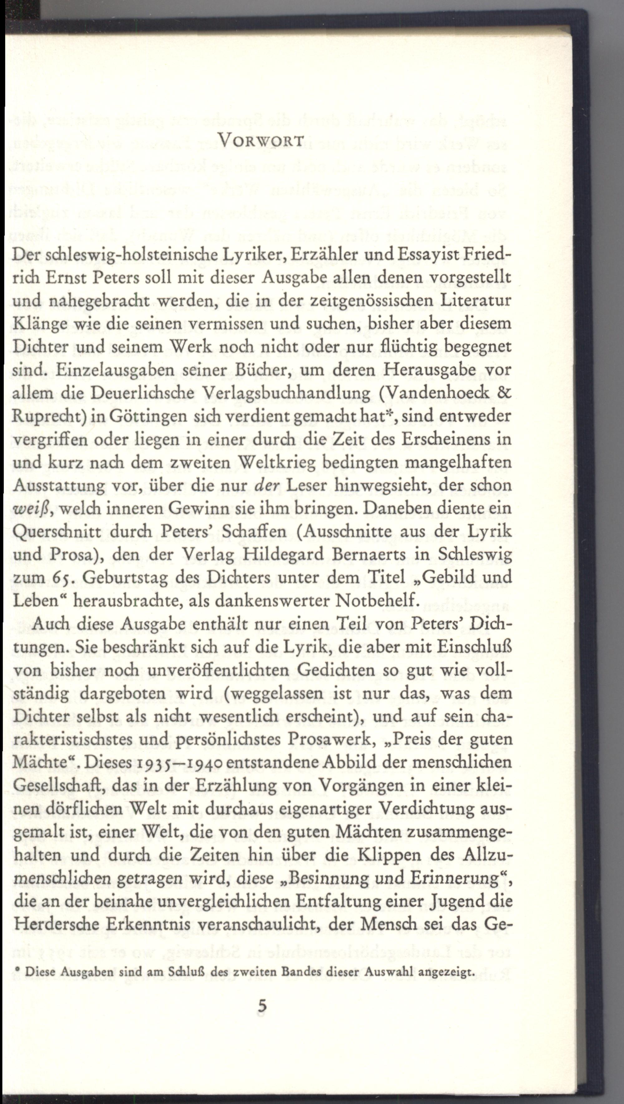 Der schleswig-holsteinische Lyriker, Erzähler und Essayist Friedrich Ernst Peters soll mit dieser Ausgabe allen denen vorgestellt und nahegebracht werden, die in der zeitgenössischen Literatur Klänge wie die seinen vermissen und suchen, bisher aber diesem Dichter und seinem Werk noch nicht oder nur flüchtig begegnet sind. Einzelausgaben seiner Bücher, um deren Herausgabe vor allem die Deuerlichsche Verlagsbuchhandlung(Vandenhoeck& Ruprecht) in Göttingen sich verdient gemacht hat*, sind entweder vergriffen oder liegen in einer durch die Zeit des Erscheinens in und kurz nach dem zweiten Weltkrieg bedingten mangelhaften Ausstattung vor, über die nur der Leser hinwegsieht, der schon weiß, welch inneren Gewinn sie ihm bringen. Daneben diente ein Querschnitt durch Peters’ Schaffen(Ausschnitte aus der Lyrik und Prosa), den der Verlag Hildegard Bernaerts in Schleswig zum 65. Geburtstag des Dichters unter dem Titel„Gebild und Leben“ herausbrachte, als dankenswerter Notbehelf.