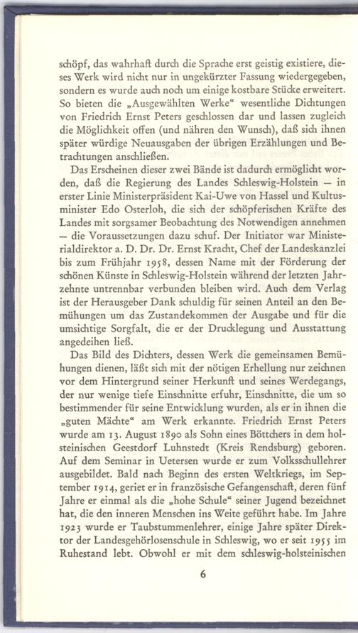 Das Bild des Dichters, dessen Werk die gemeinsamen Bemühungen dienen, läßt sich mit der nötigen Erhellung nur zeichnen vor dem Hintergrund seiner Herkunft und seines Werdegangs, der nur wenige tiefe Einschnitte erfuhr, Einschnitte, die um so bestimmender für seine Entwicklung wurden, als er in ihnen die „guten Mächte“ am Werk erkannte. Friedrich Ernst Peters wurde am 13. August 1890 als Sohn eines Böttchers in dem holsteinischen Geestdorf Luhnstedt(Kreis Rendsburg) geboren. Auf dem Seminar in Uetersen wurde er zum Volksschullehrer ausgebildet. Bald nach Beginn des ersten Weltkriegs, im September 1914, geriet er in französische Gefangenschaft, deren fünf Jahre er einmal als die„hohe Schule“ seiner Jugend bezeichnet hat, die den inneren Menschen ins Weite geführt habe. Im Jahre 1923 wurde er Taubstummenlehrer, einige Jahre später Direktor der Landesgehörlosenschule in Schleswig, wo er seit 1955 im Ruhestand lebt. Obwohl er mit dem schleswig-holsteinischen